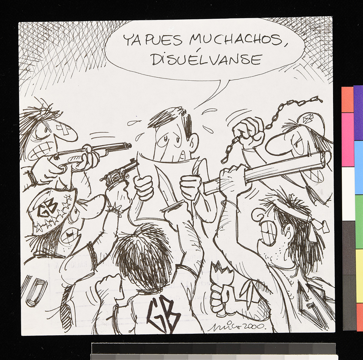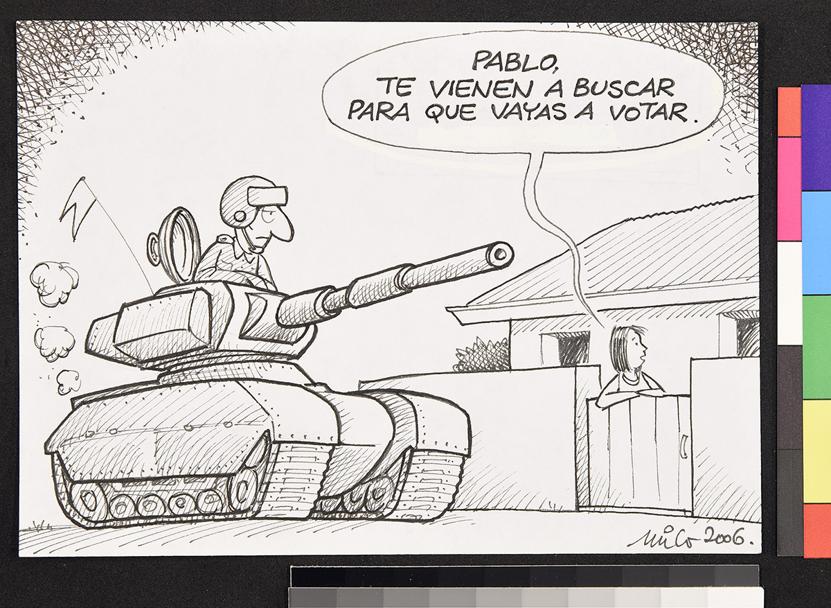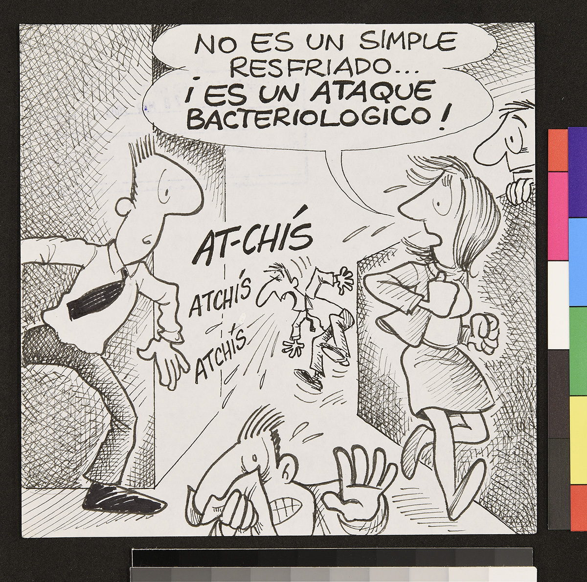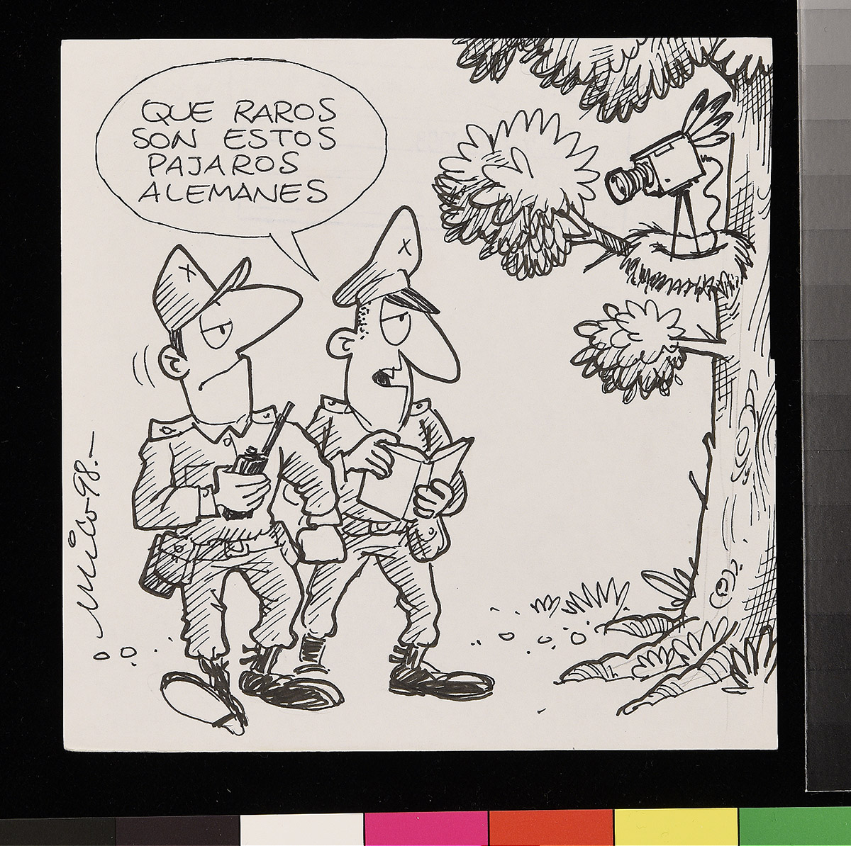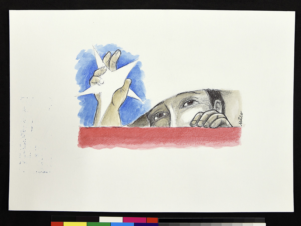 Dibujo de un soldado que está dentro de un fuerte construidos por sacos de arena, con una pequeña obertura como ventana. Desde ahí se pueden ver varios microfonos. Arriba de la construcción se pueden ver varias armas.