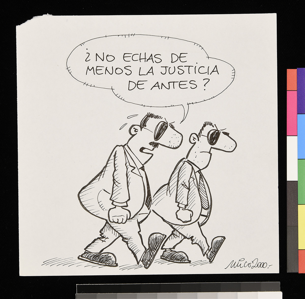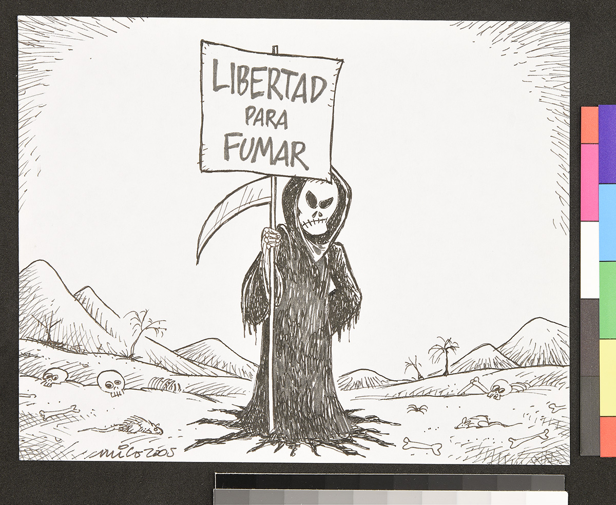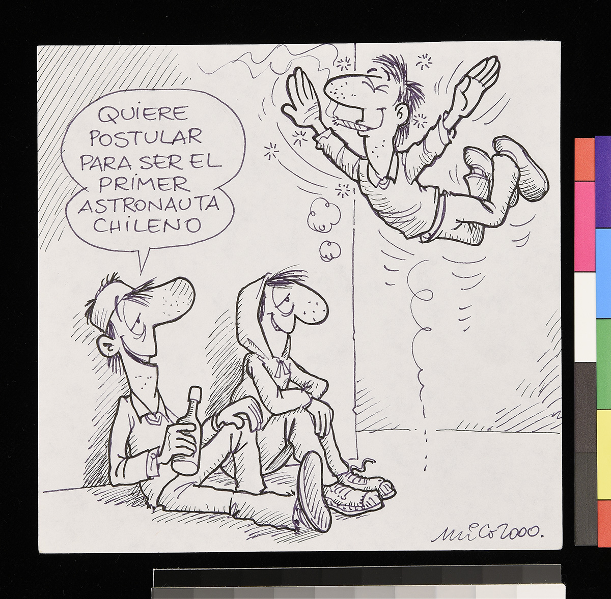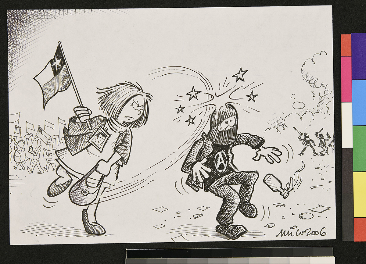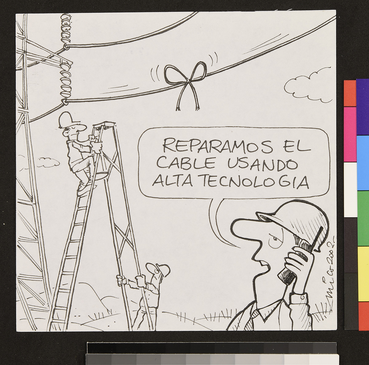 Dibujo de un soldado que está dentro de un fuerte construidos por sacos de arena, con una pequeña obertura como ventana. Desde ahí se pueden ver varios microfonos. Arriba de la construcción se pueden ver varias armas.