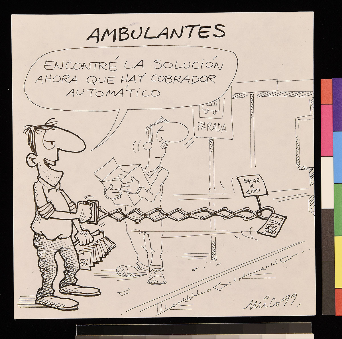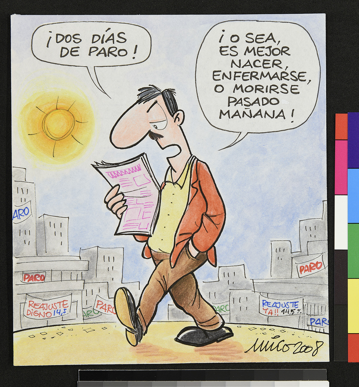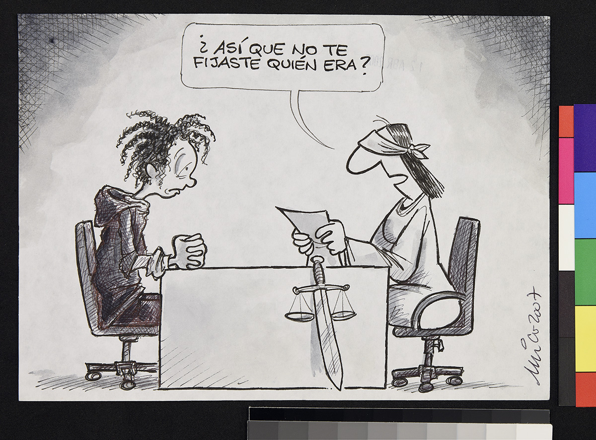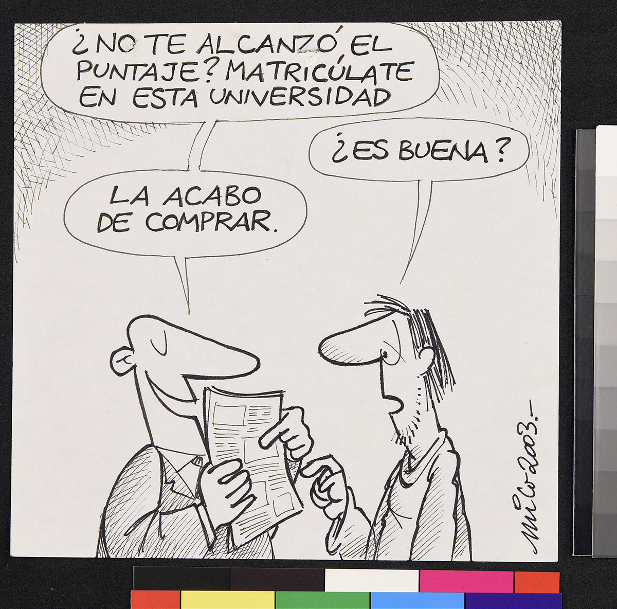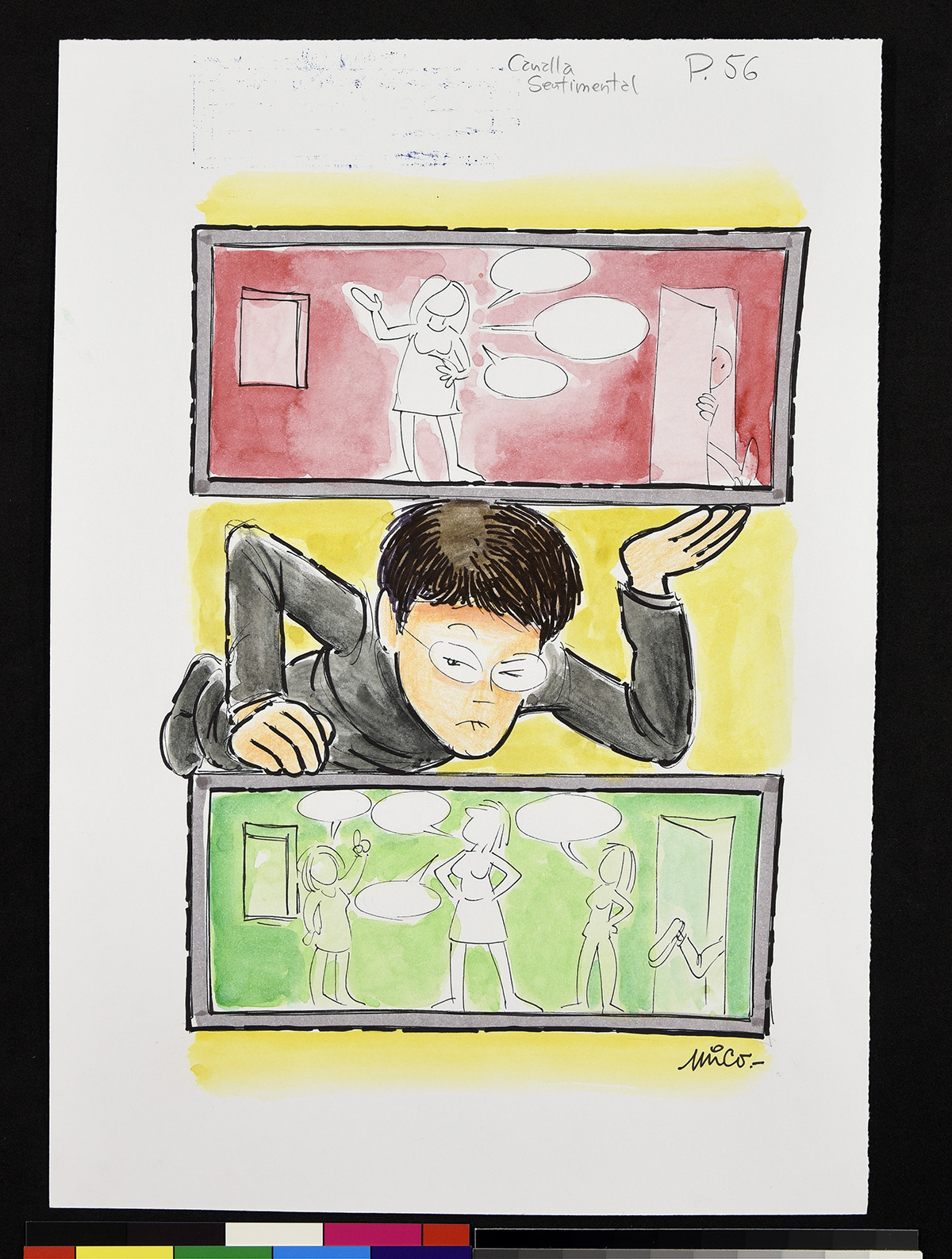 Dibujo de un soldado que está dentro de un fuerte construidos por sacos de arena, con una pequeña obertura como ventana. Desde ahí se pueden ver varios microfonos. Arriba de la construcción se pueden ver varias armas.