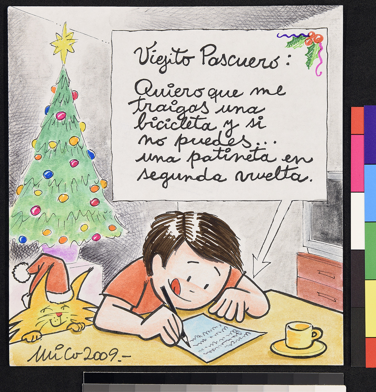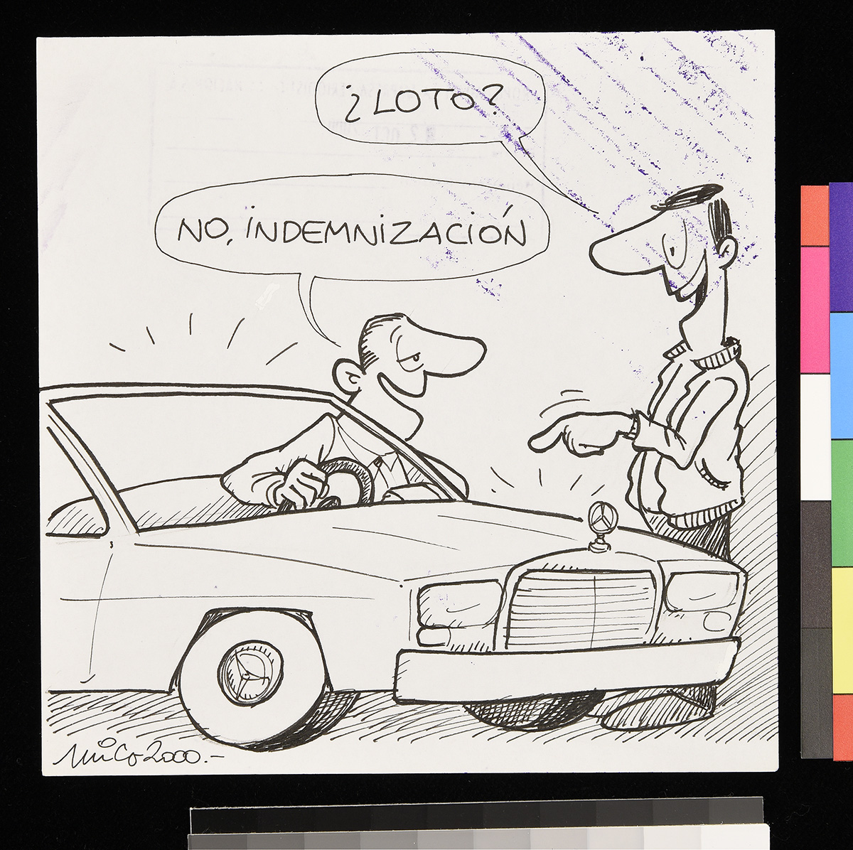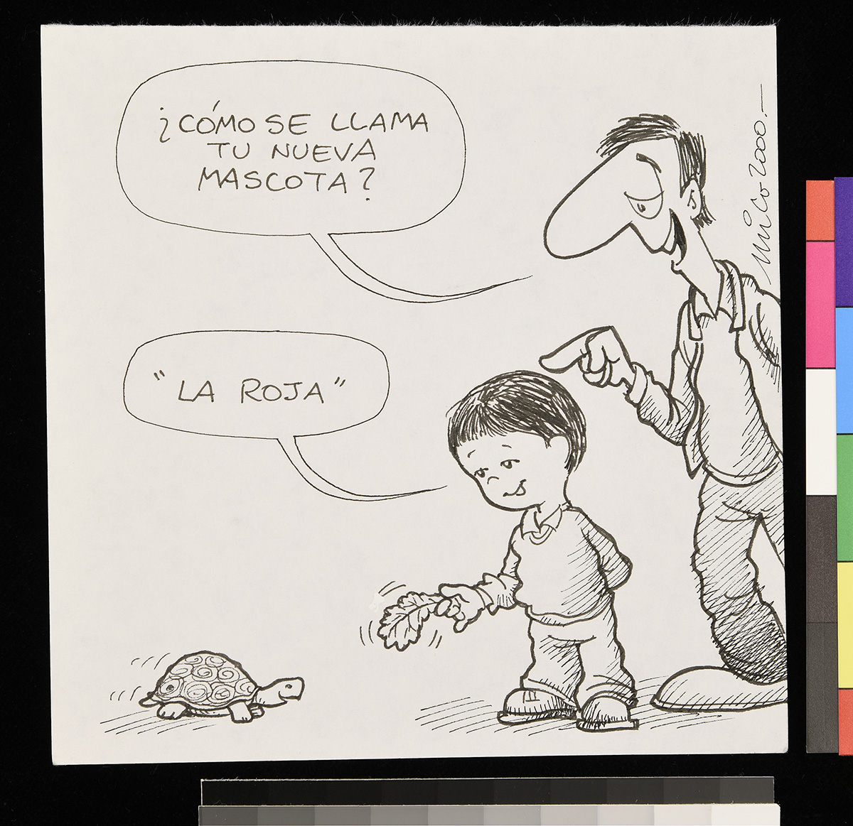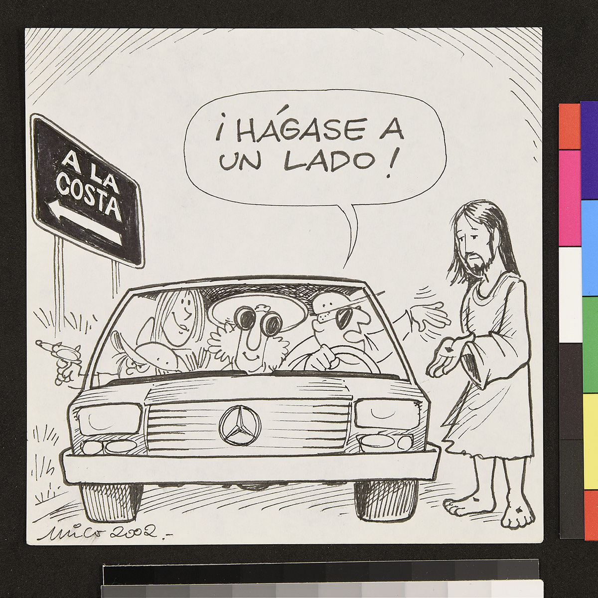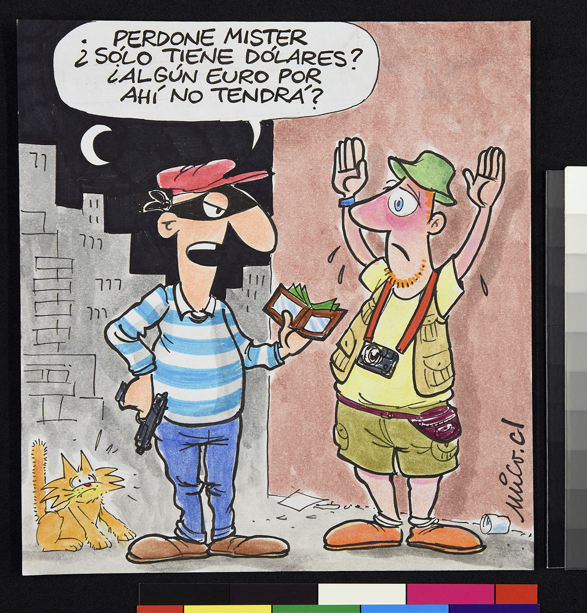 Dibujo de un soldado que está dentro de un fuerte construidos por sacos de arena, con una pequeña obertura como ventana. Desde ahí se pueden ver varios microfonos. Arriba de la construcción se pueden ver varias armas.