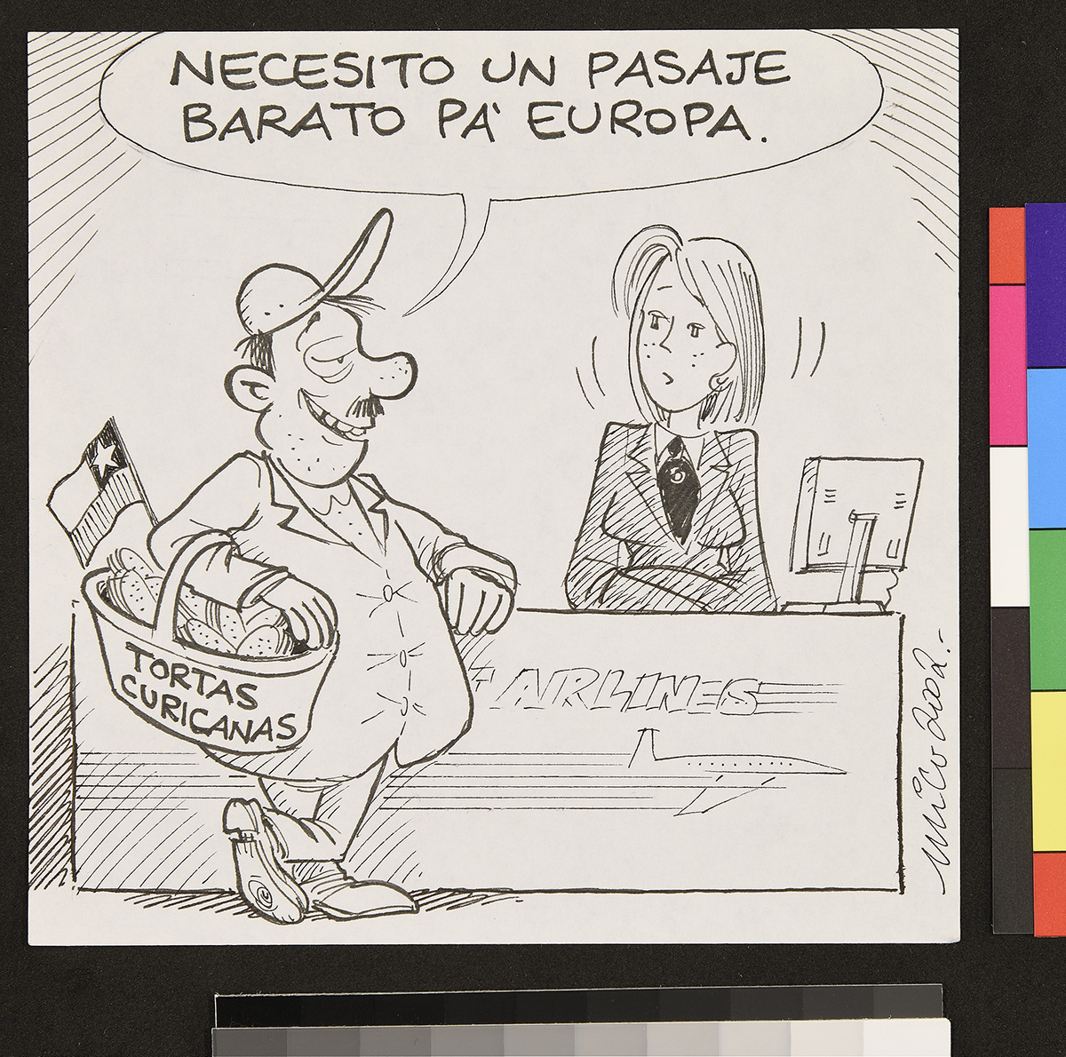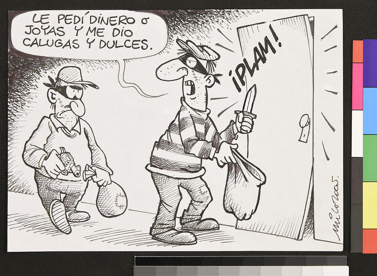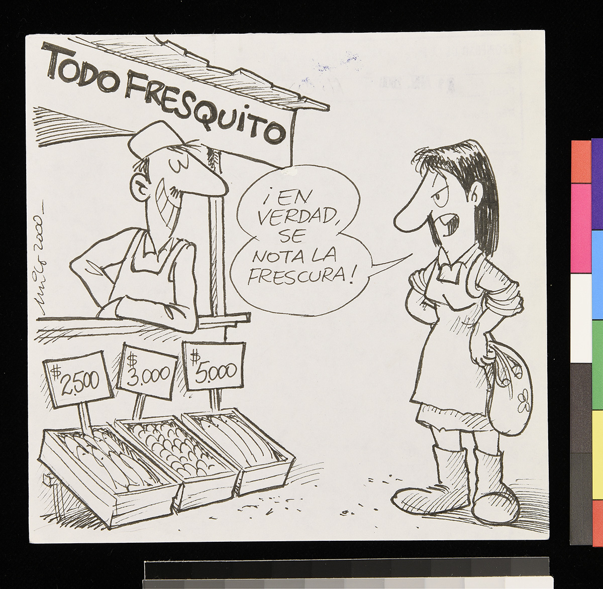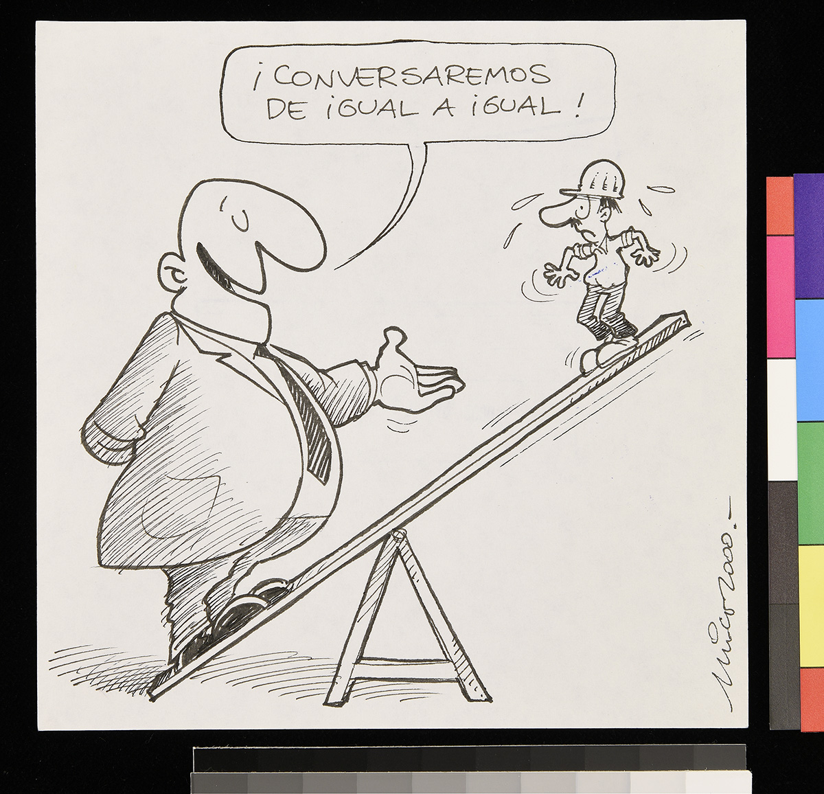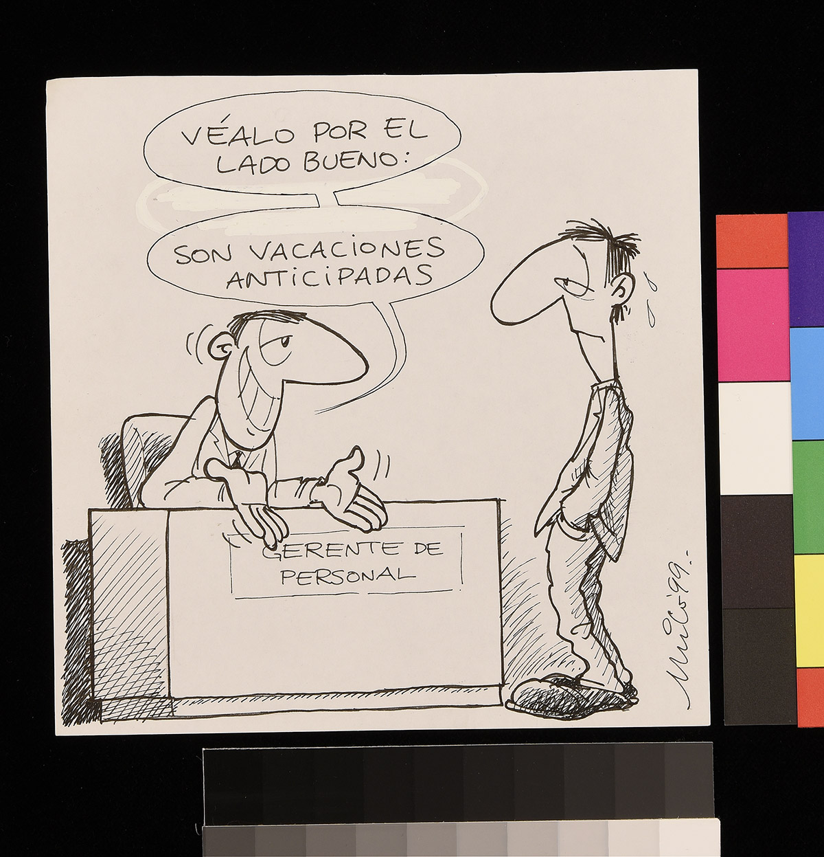 Dibujo de un hombre que aparece de un módulo de trabajo para conversar con otro hombre que arrastra una carretilla llena de sal de fruta. Al costado derecho de la caricatura se ve a una mujer con una bolsa de hielo en la cabeza y a un hombre frente a una pantalla.