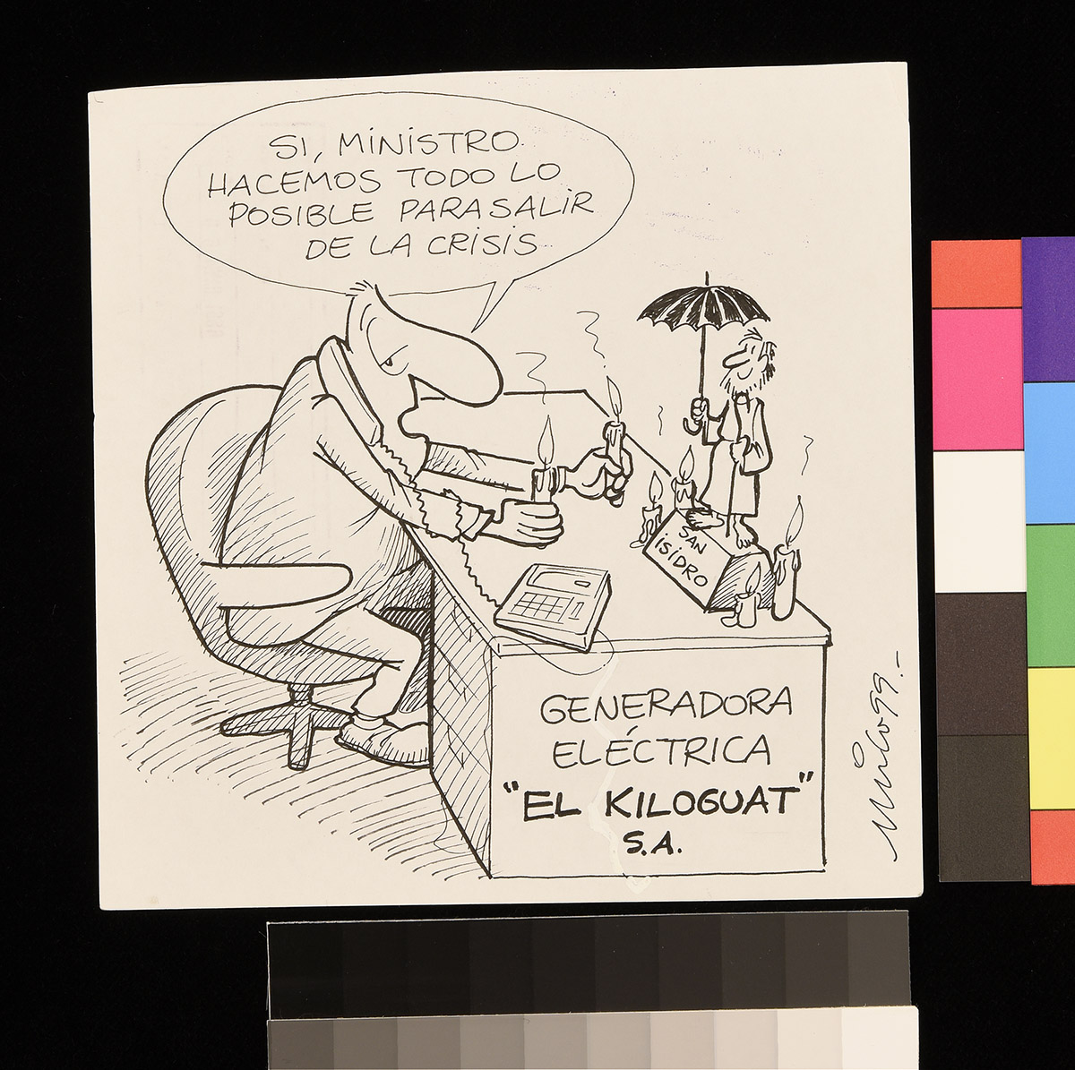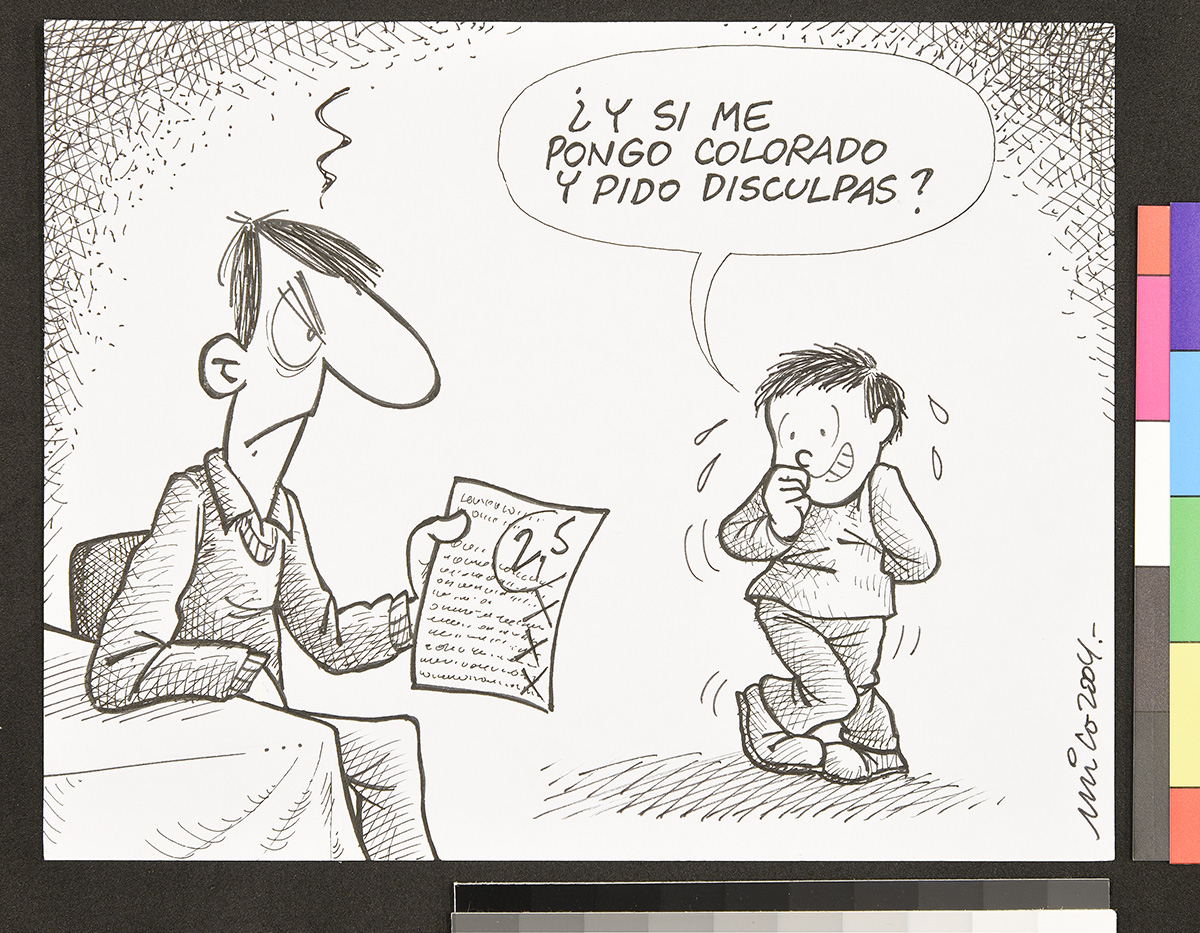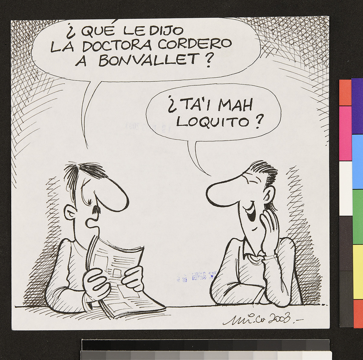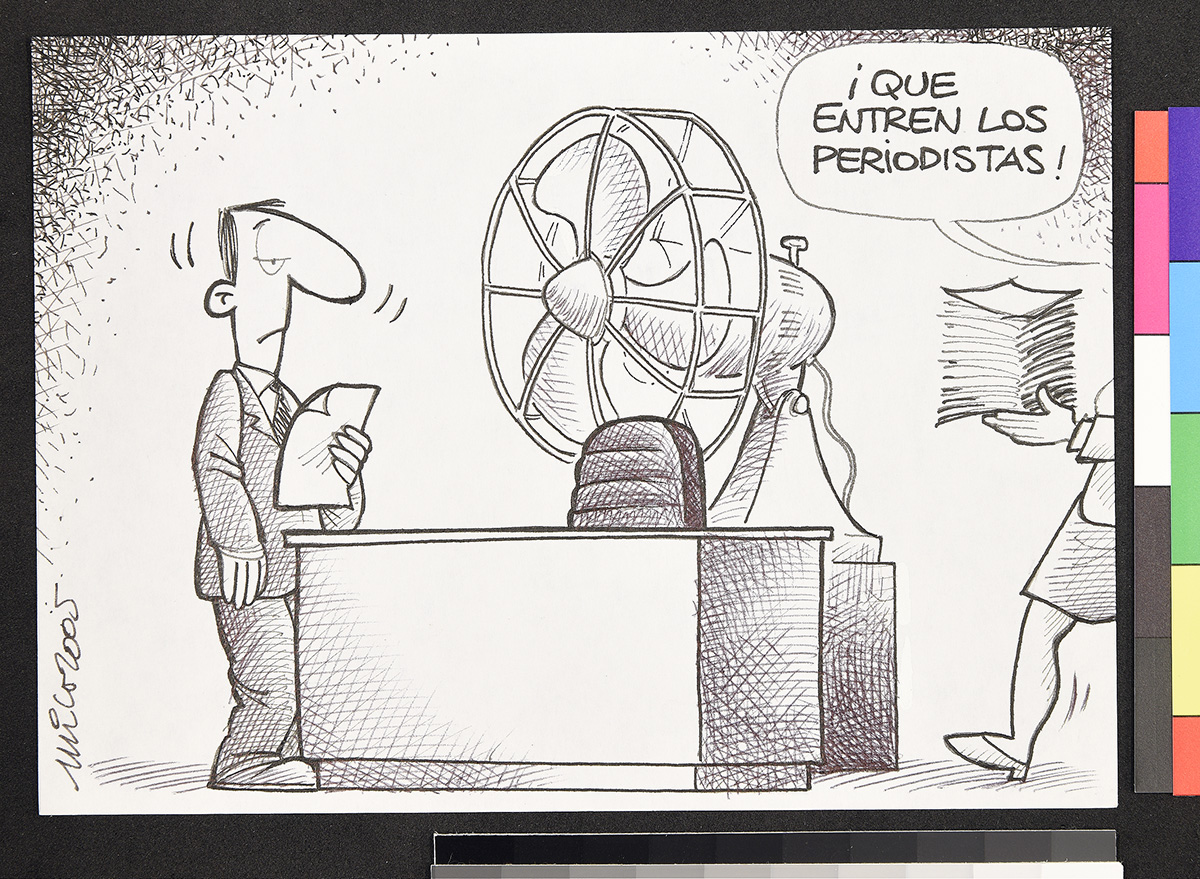 Dibujo de un hombre que aparece de un módulo de trabajo para conversar con otro hombre que arrastra una carretilla llena de sal de fruta. Al costado derecho de la caricatura se ve a una mujer con una bolsa de hielo en la cabeza y a un hombre frente a una pantalla.