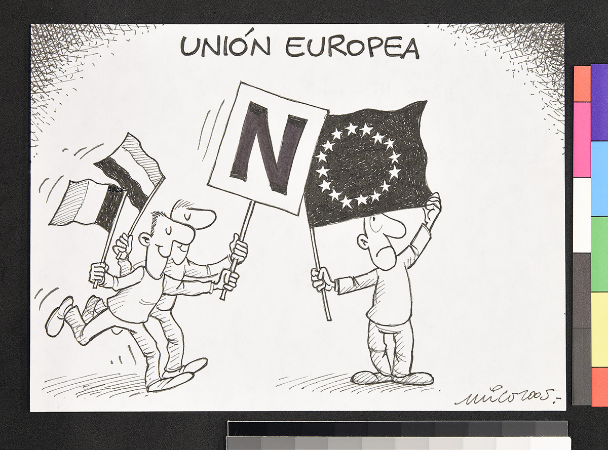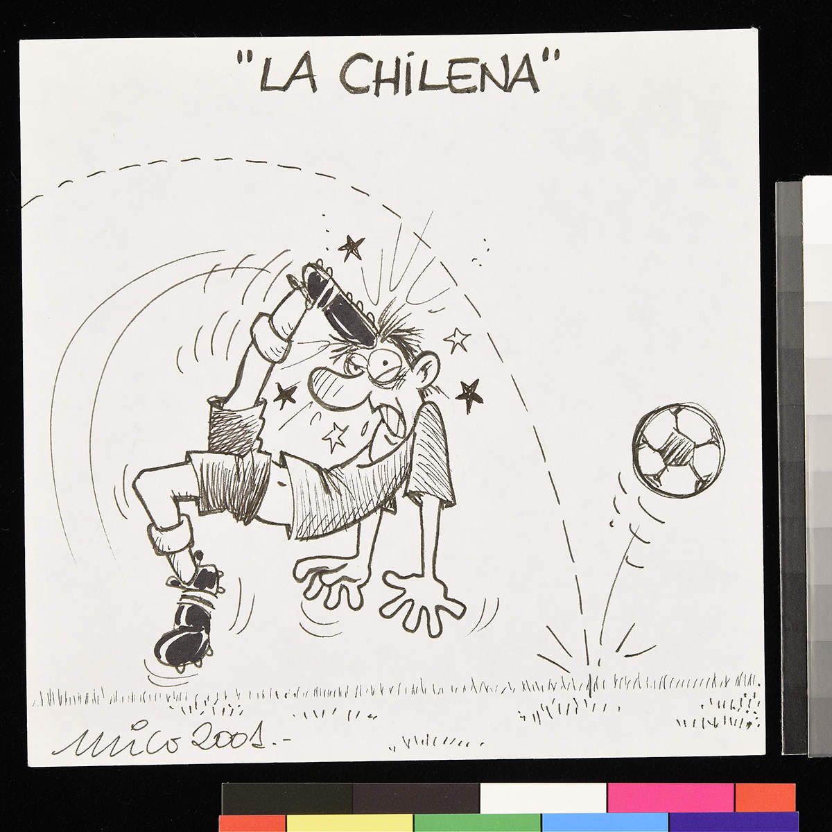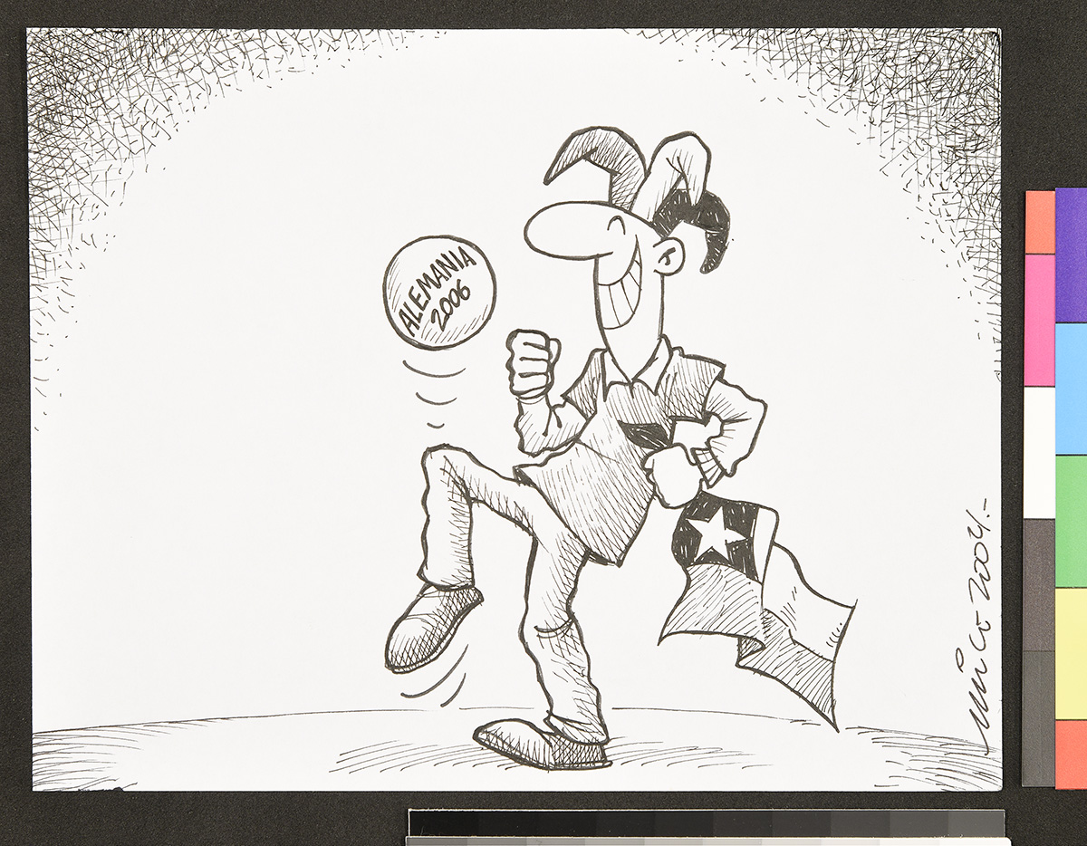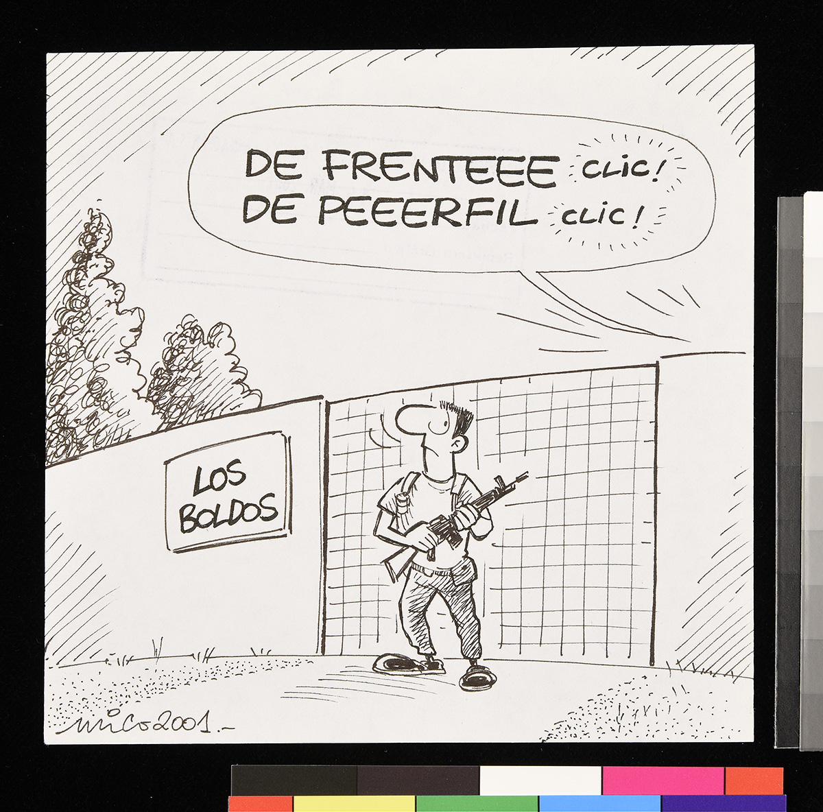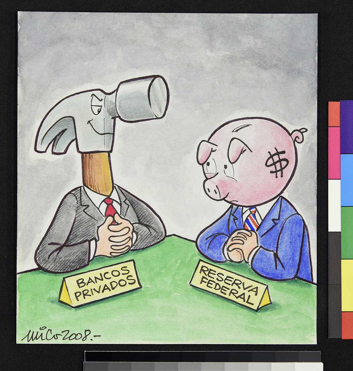 Dibujo de un hombre que aparece de un módulo de trabajo para conversar con otro hombre que arrastra una carretilla llena de sal de fruta. Al costado derecho de la caricatura se ve a una mujer con una bolsa de hielo en la cabeza y a un hombre frente a una pantalla.