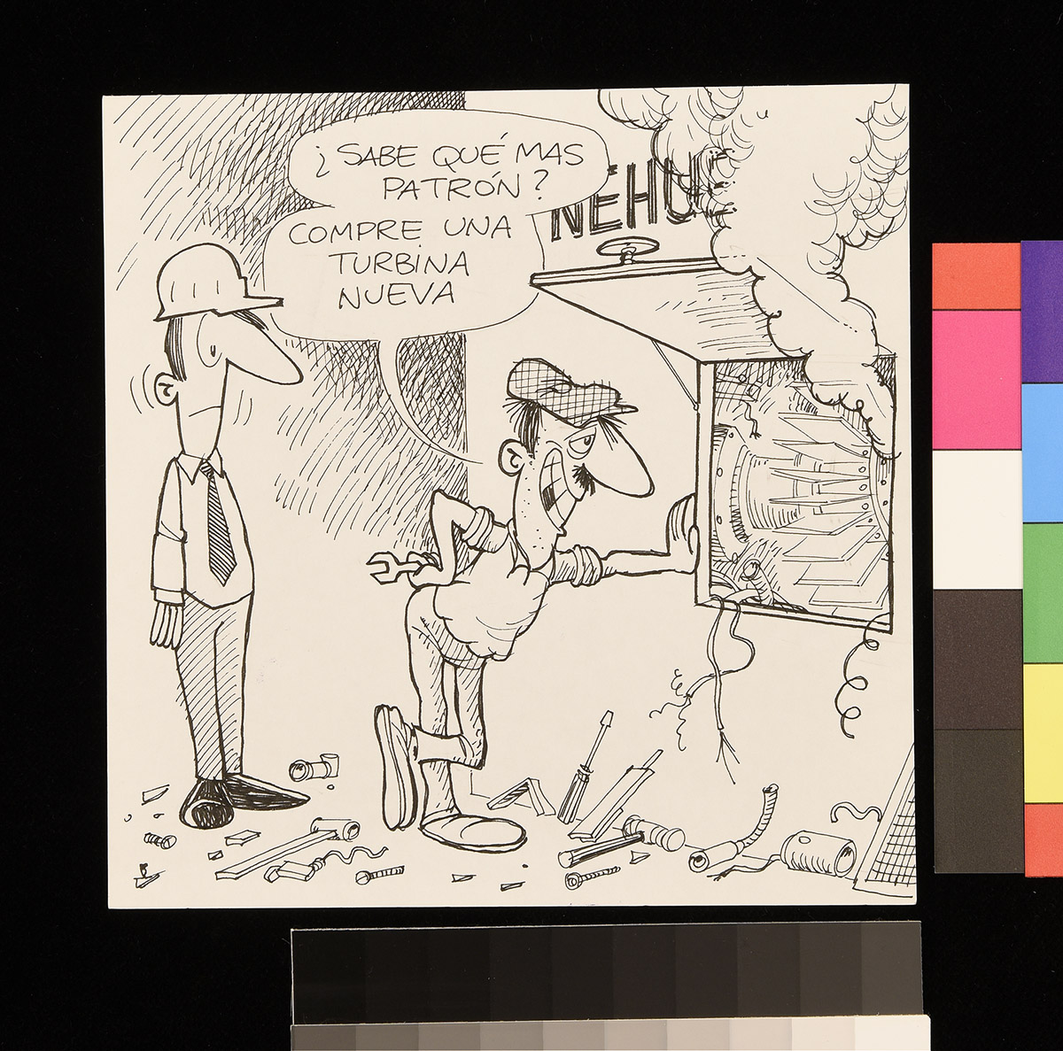 Dibujo de un hombre que camina mientras tapa su rostro con su polera y lleva en sus manos un bolso y una red con pelotas de futbol. Un hombre al costado derecho está de pie, apoyado sus manos en una baranda.