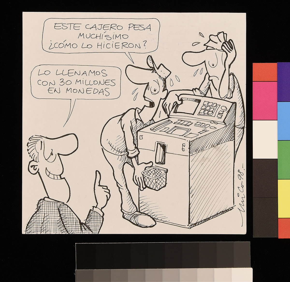 En el primer plano del dibujo un hombre se encuentra completamente sucio ya que acaba de explotar un computador. Al fondo otro hombre conversar con él llevando a su mano izquierda algunos papeles.