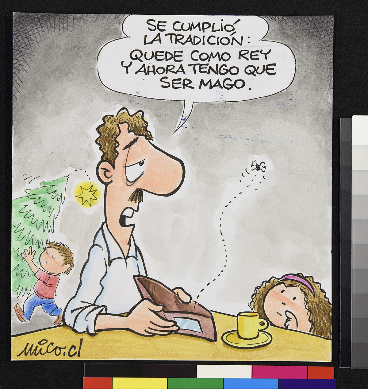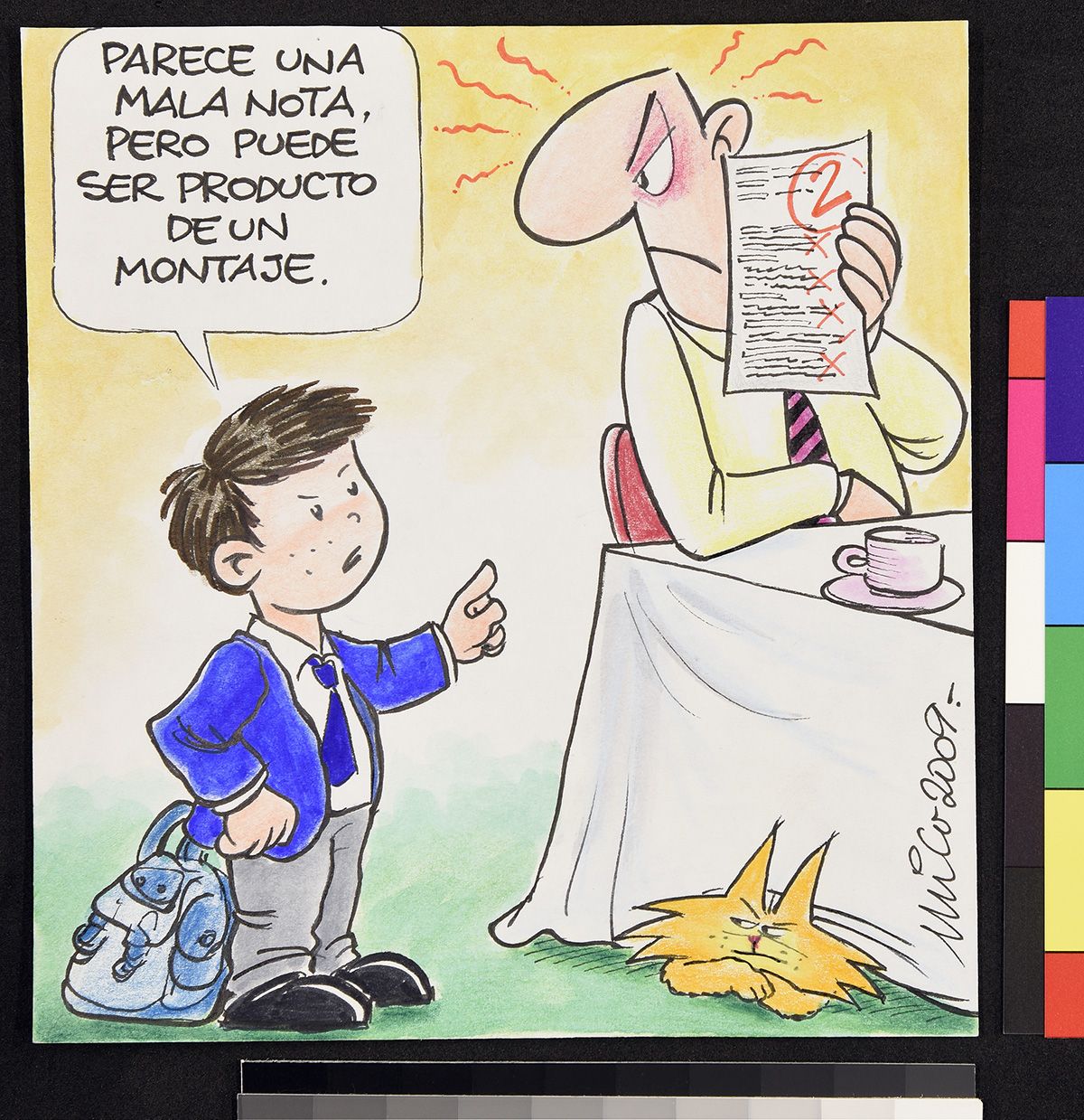 Dibujo de una mujer que habla por teléfono mientras se afirma en un poste de luz. Al costado derecho de la caricatura se ve a un conductor que mira a la mujer desde sus automovil.