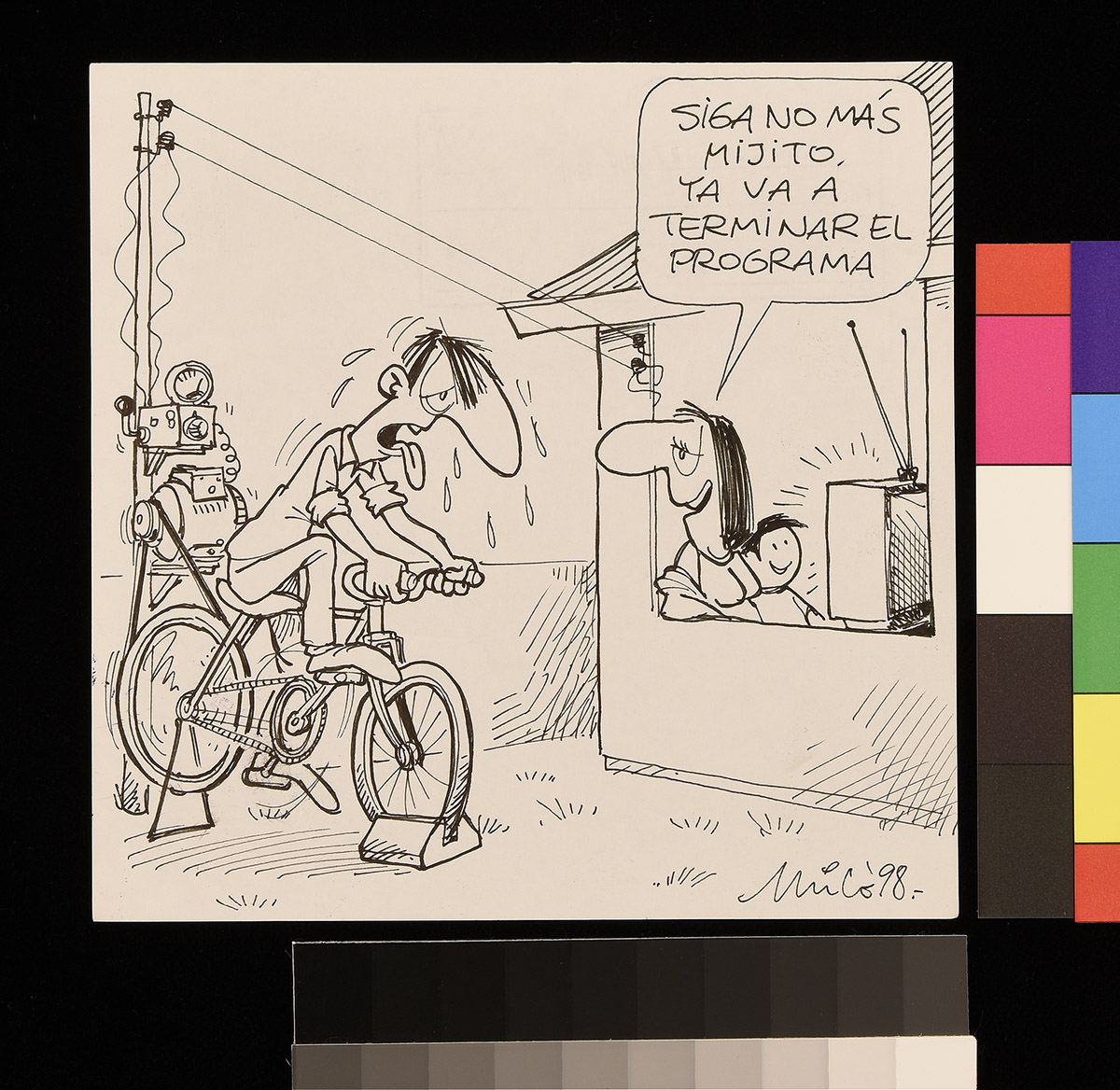 Dibujo de un submarino con ruedas, reemplazando al bus de transporte público, que se acerca una parada de bus donde hay tres pasajeros esperando