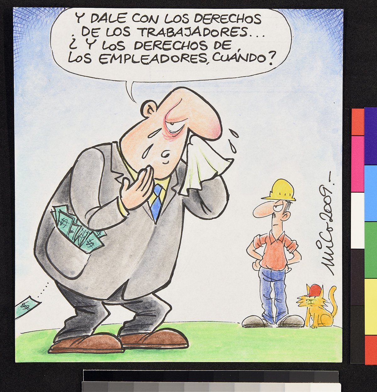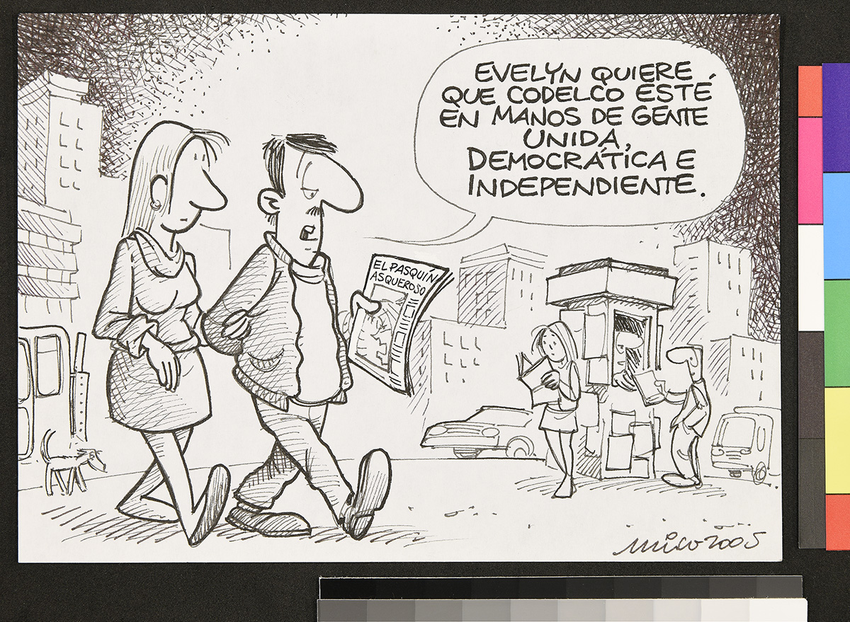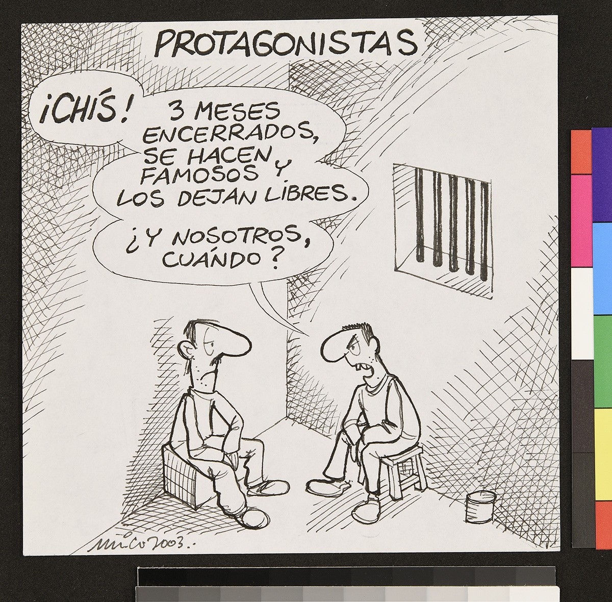 Dibujo de un automóvil completamente aplastado por sus lados, incluido el conductor del mismo. Otro hombre mira la escena desde una esquina de una cuadra, junto a un grifo.