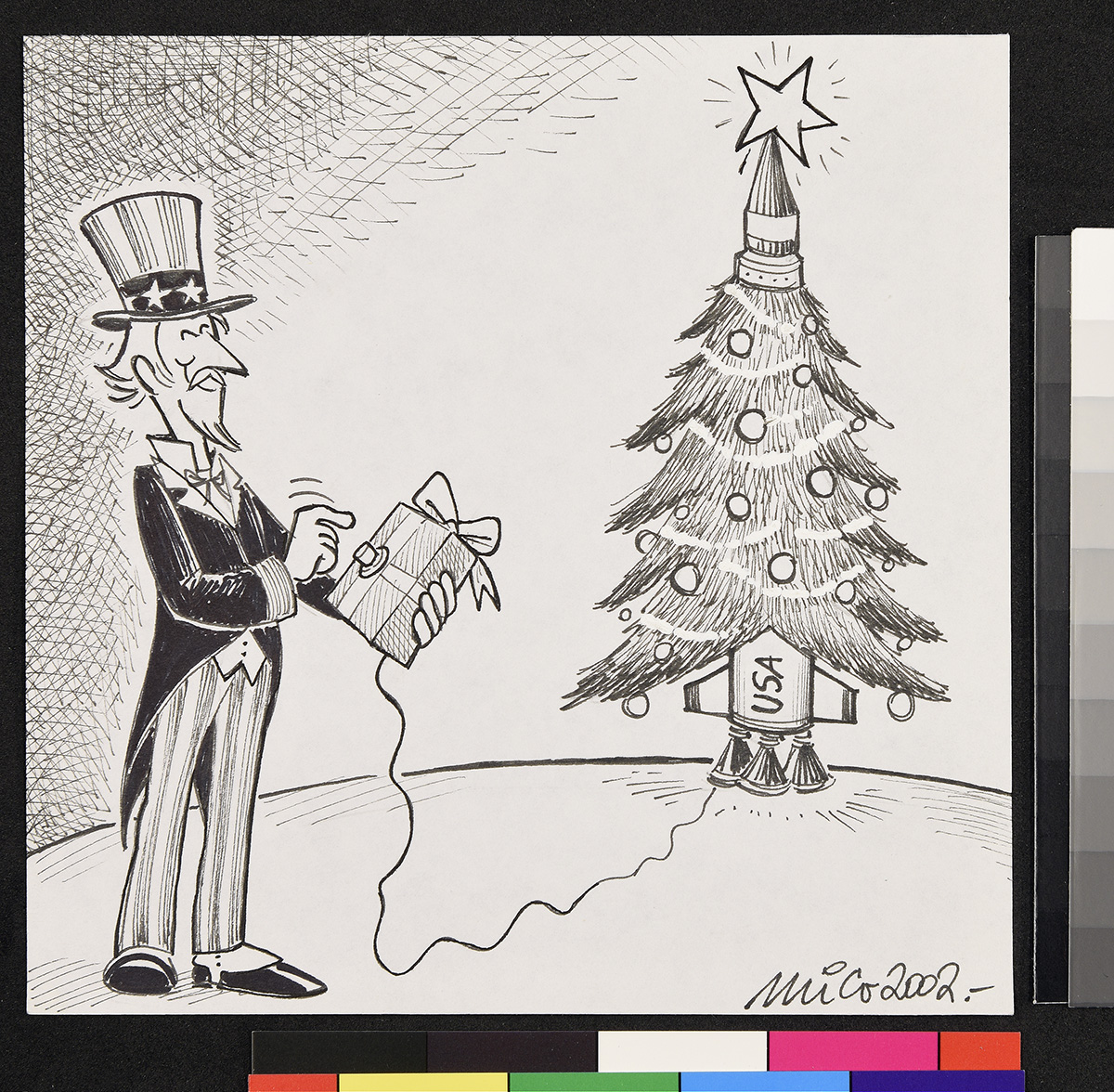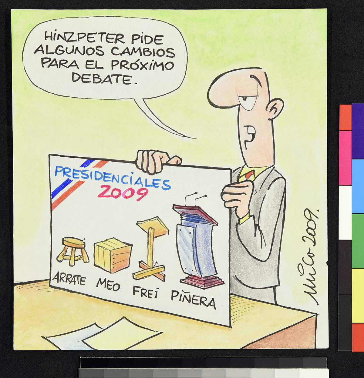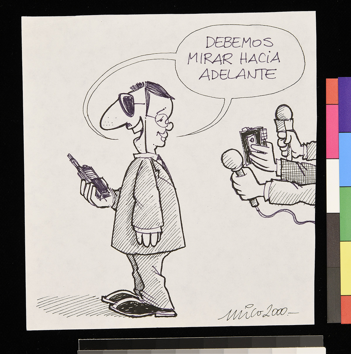 Dibujo de un automóvil completamente aplastado por sus lados, incluido el conductor del mismo. Otro hombre mira la escena desde una esquina de una cuadra, junto a un grifo.