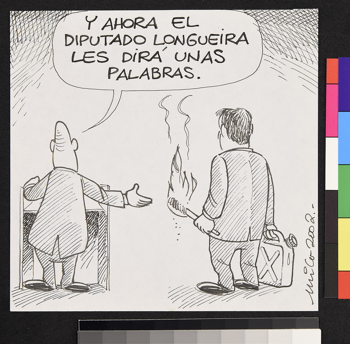 Dibujo de un árbitro que muestra la tarjeta roja a la hinchada que está en la galería del estadio haciendo disturbios. Habla con un Carabinero de fuerzas especiales que sostiene un escudo y una luma.