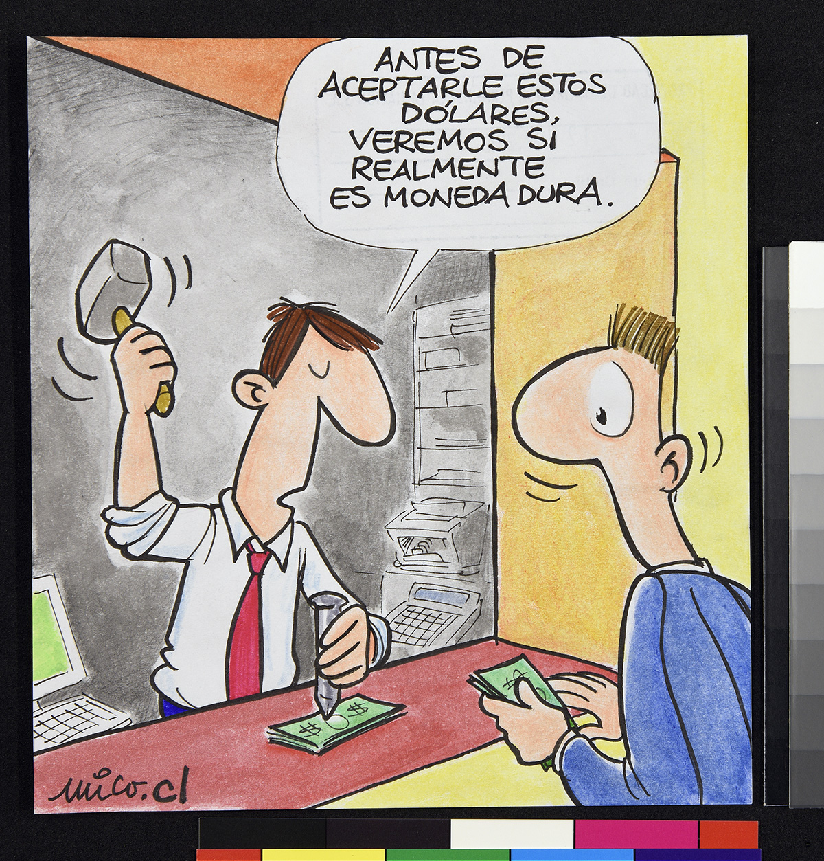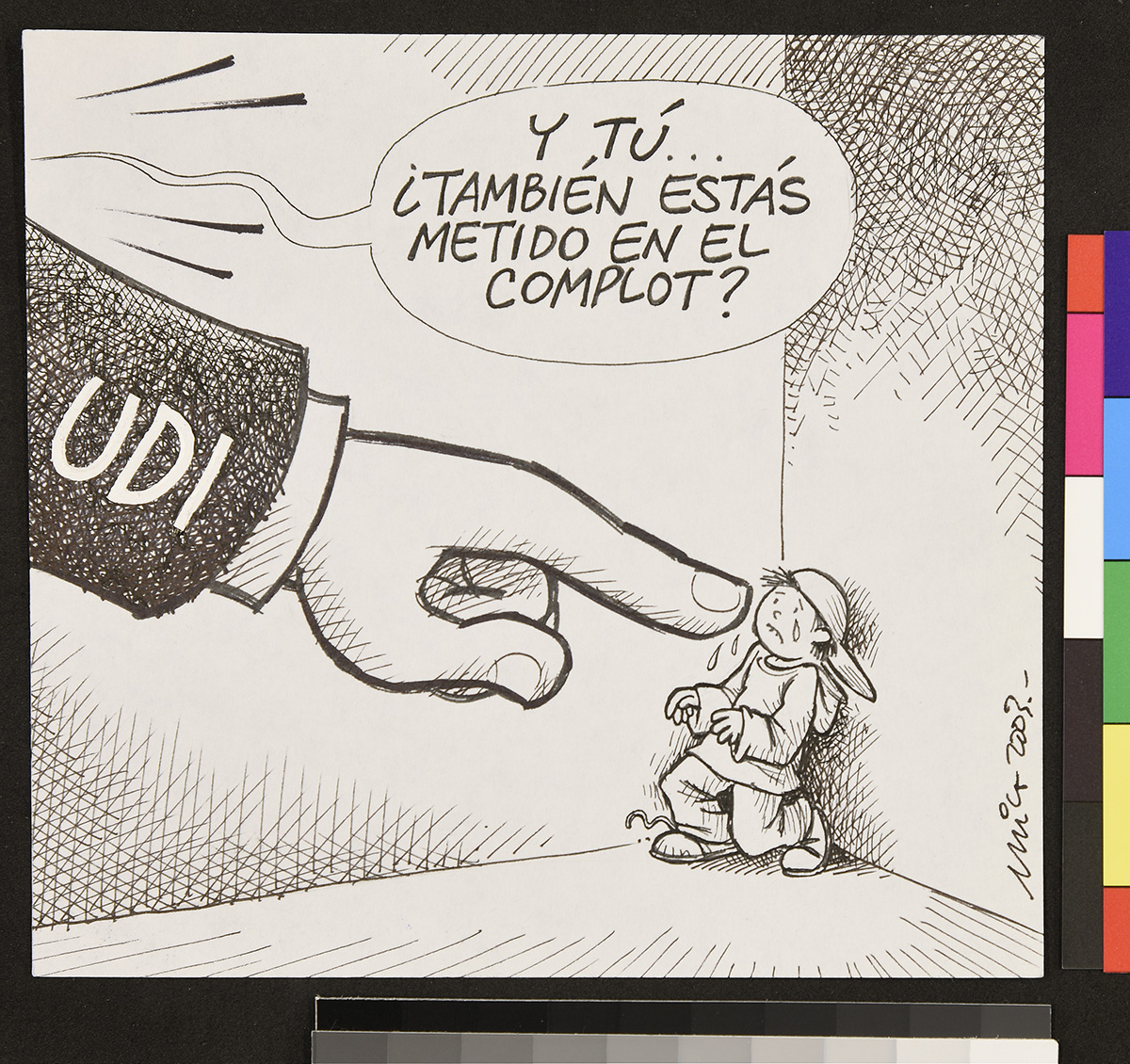 Dibujo de dos mujeres y dos hombres que están de pie, uno a lado del otro, con expresión molesta.