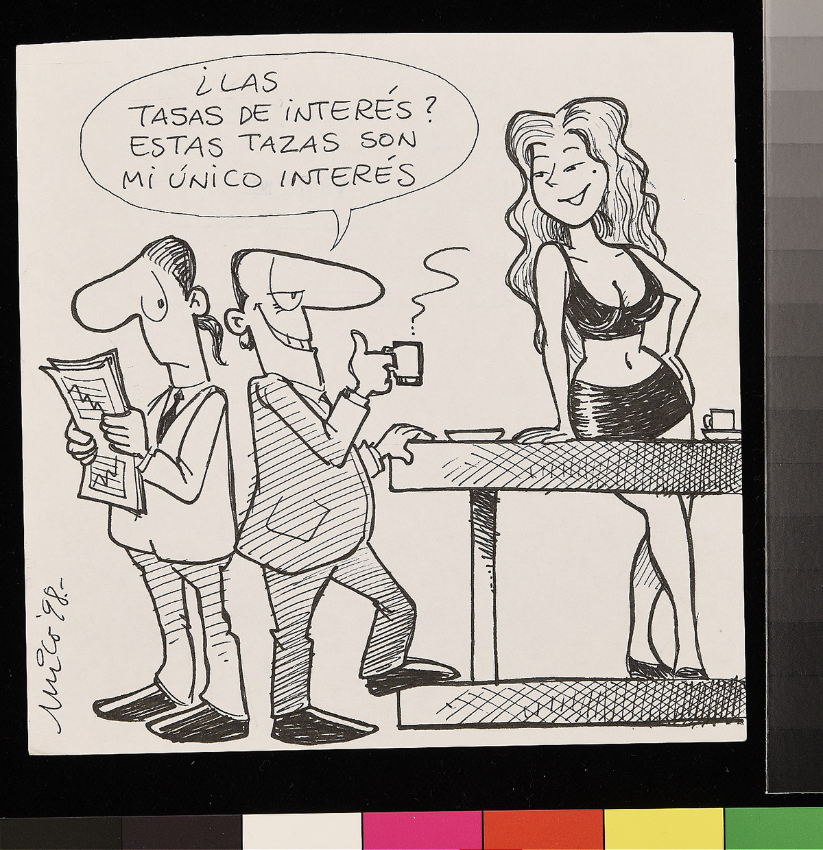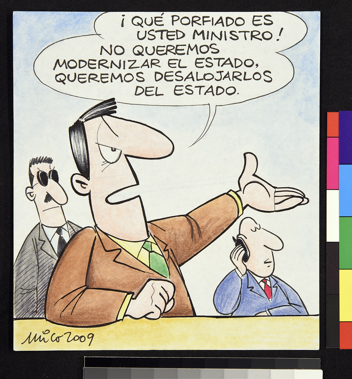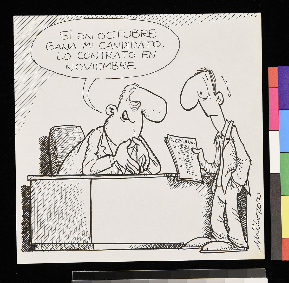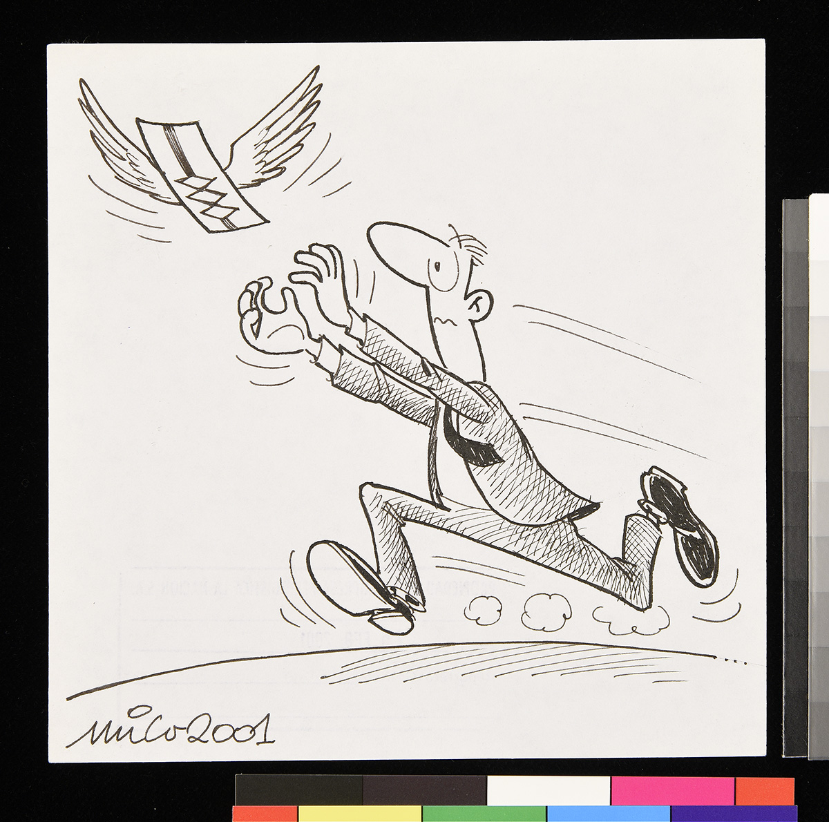 Dibujo de un hombre sentado frente a un escritorio, revisando varios papeles.