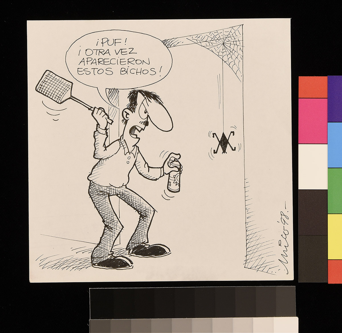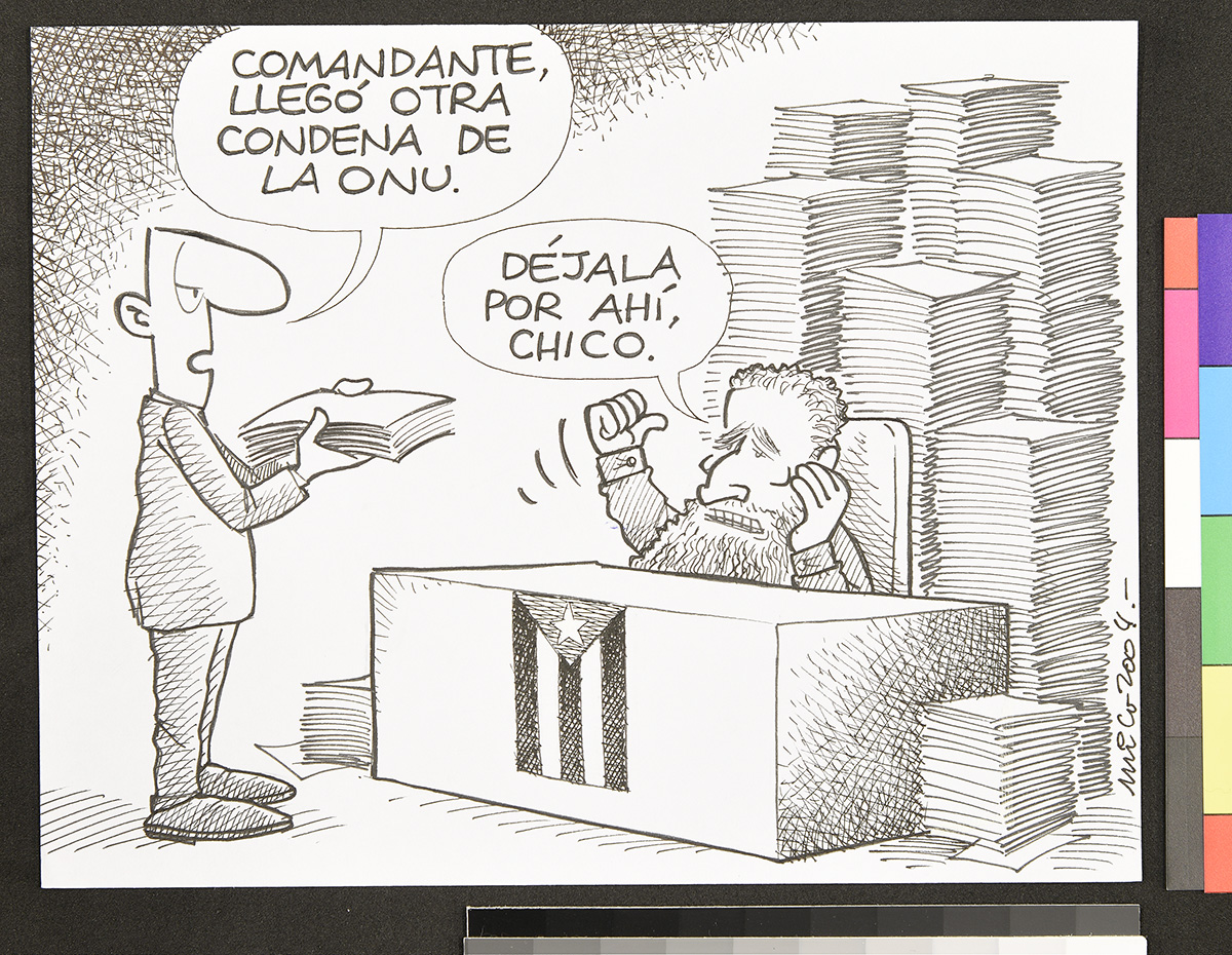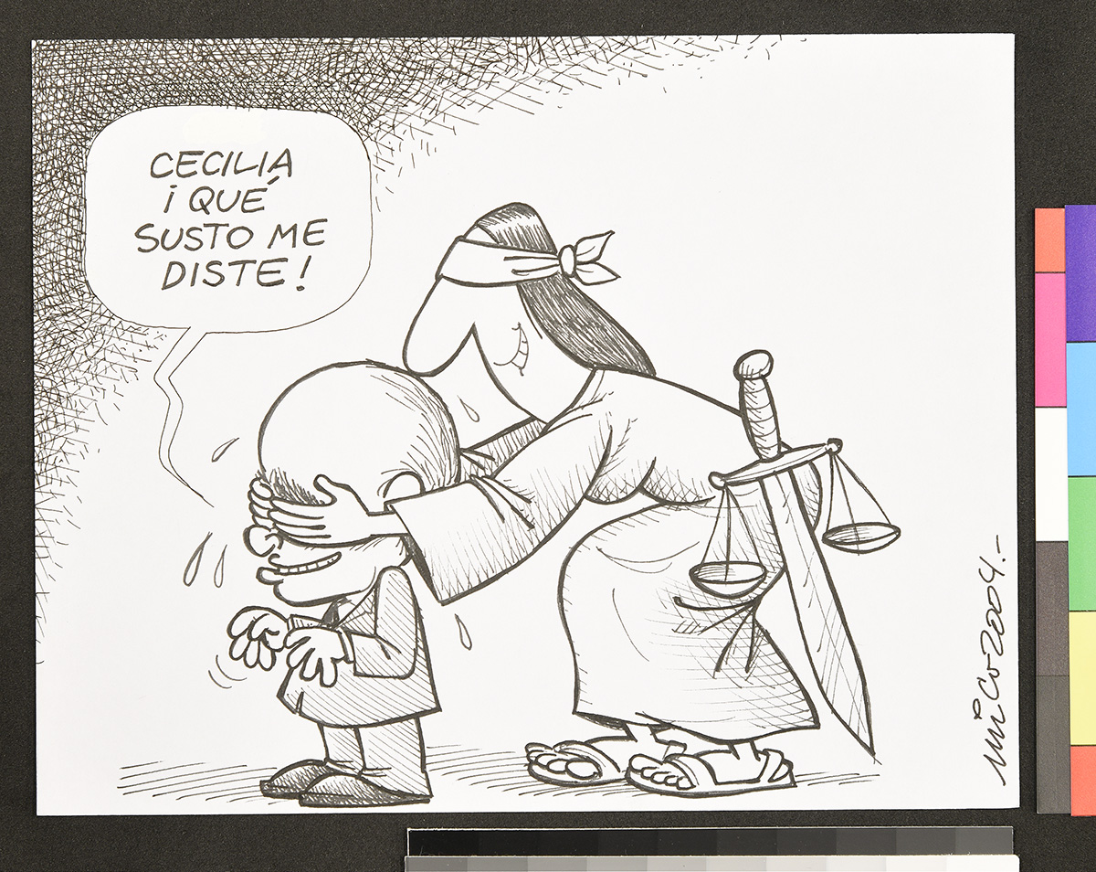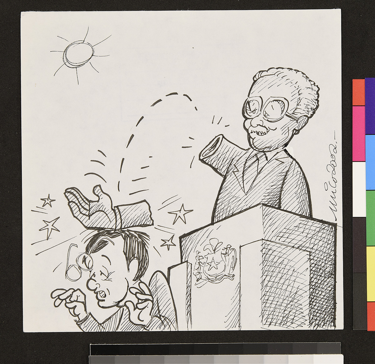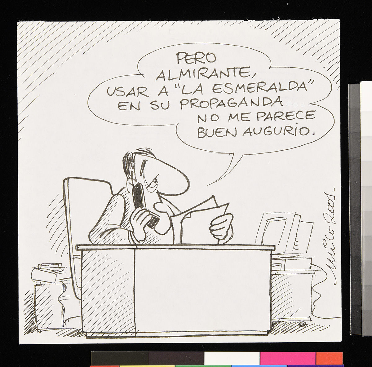 Dibujo de un hombre sentado frente a un escritorio, revisando varios papeles.