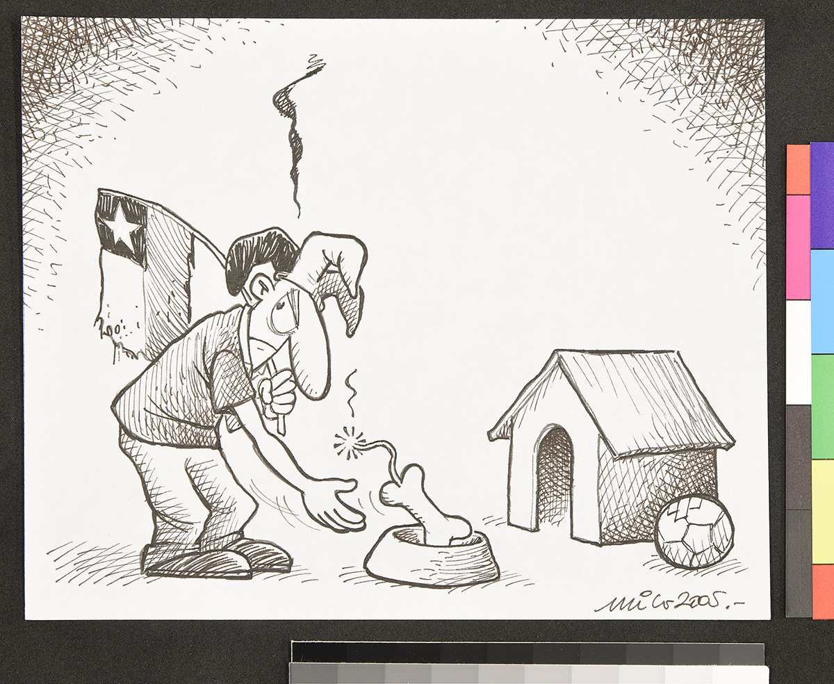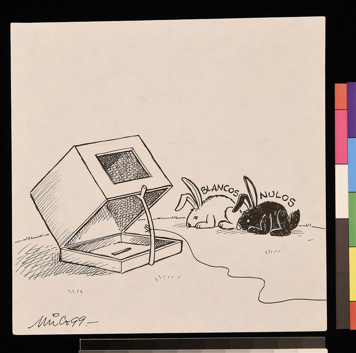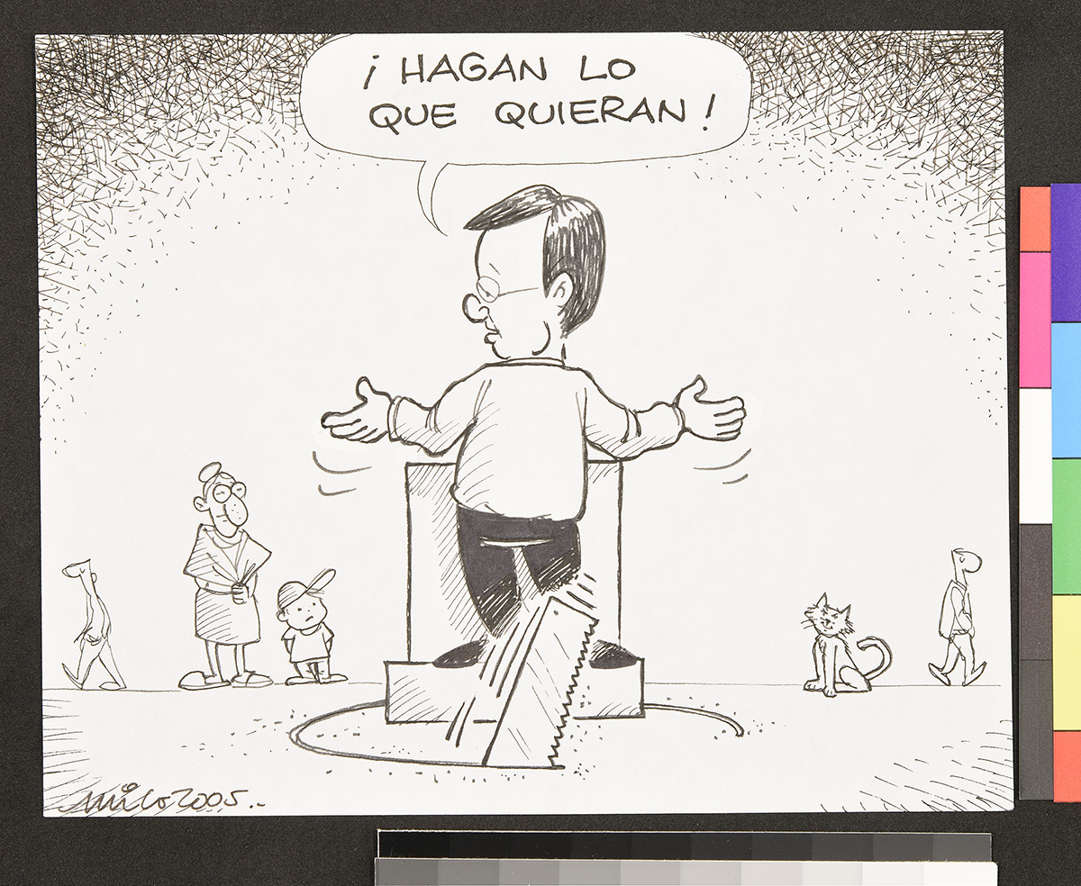Dibujo de dos hombres que arrastran carritos de madera con botellas o papel .