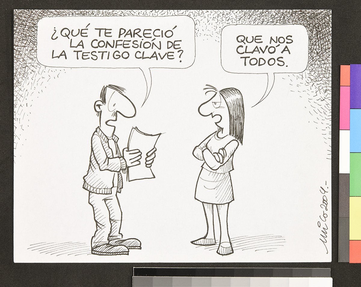 Dibujo de un hombre que da un discurso frente a un podio que tiene escrito al frente “ONU”. Se encuentra usando un casco de soldado y lleva en su cuerpo varios tipos de armas.