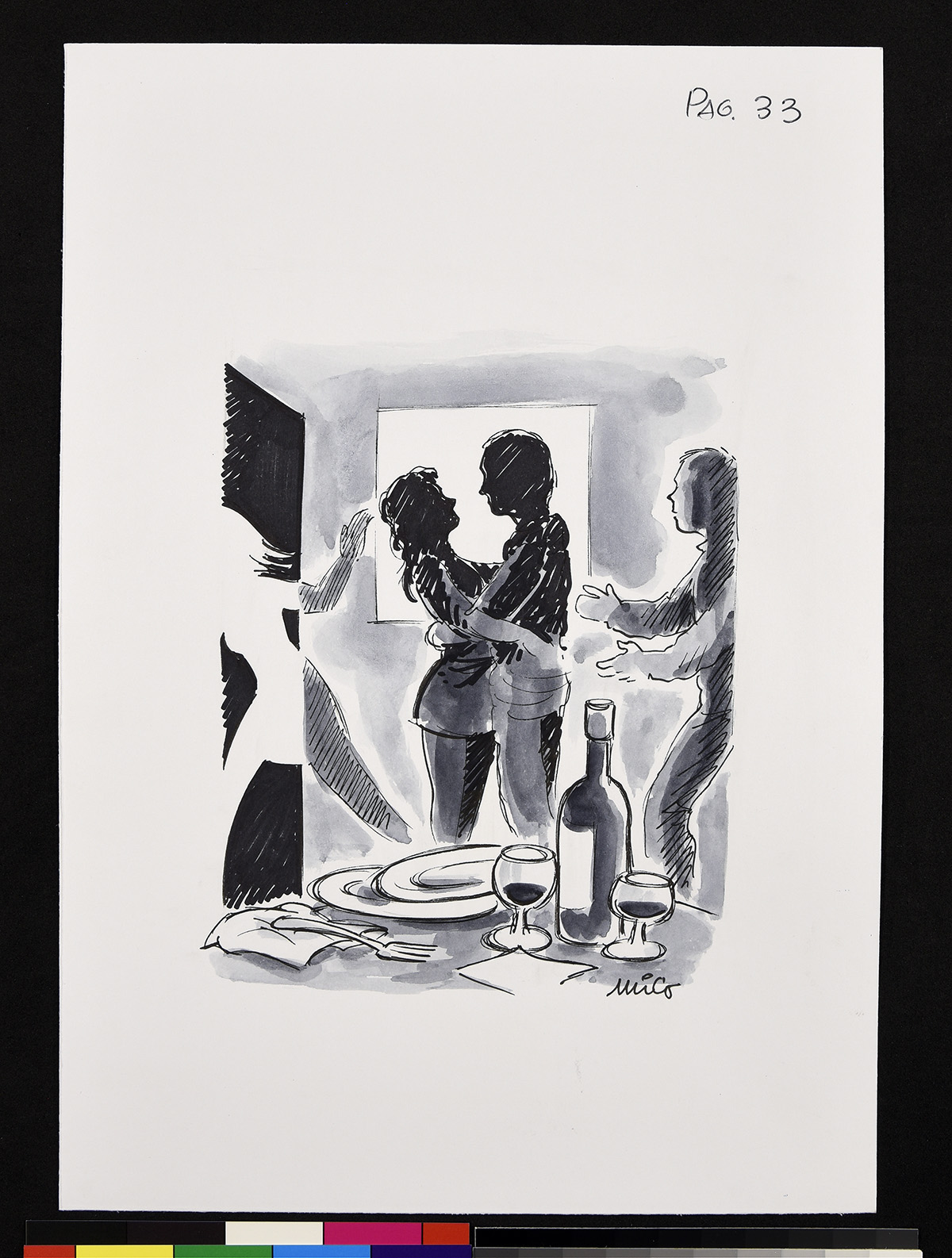 Dibujo de un hombre que por un lado toce producto del consumo de cigarrillos y por el otro mira como le inyectan una vacuna en el brazo izquierdo.