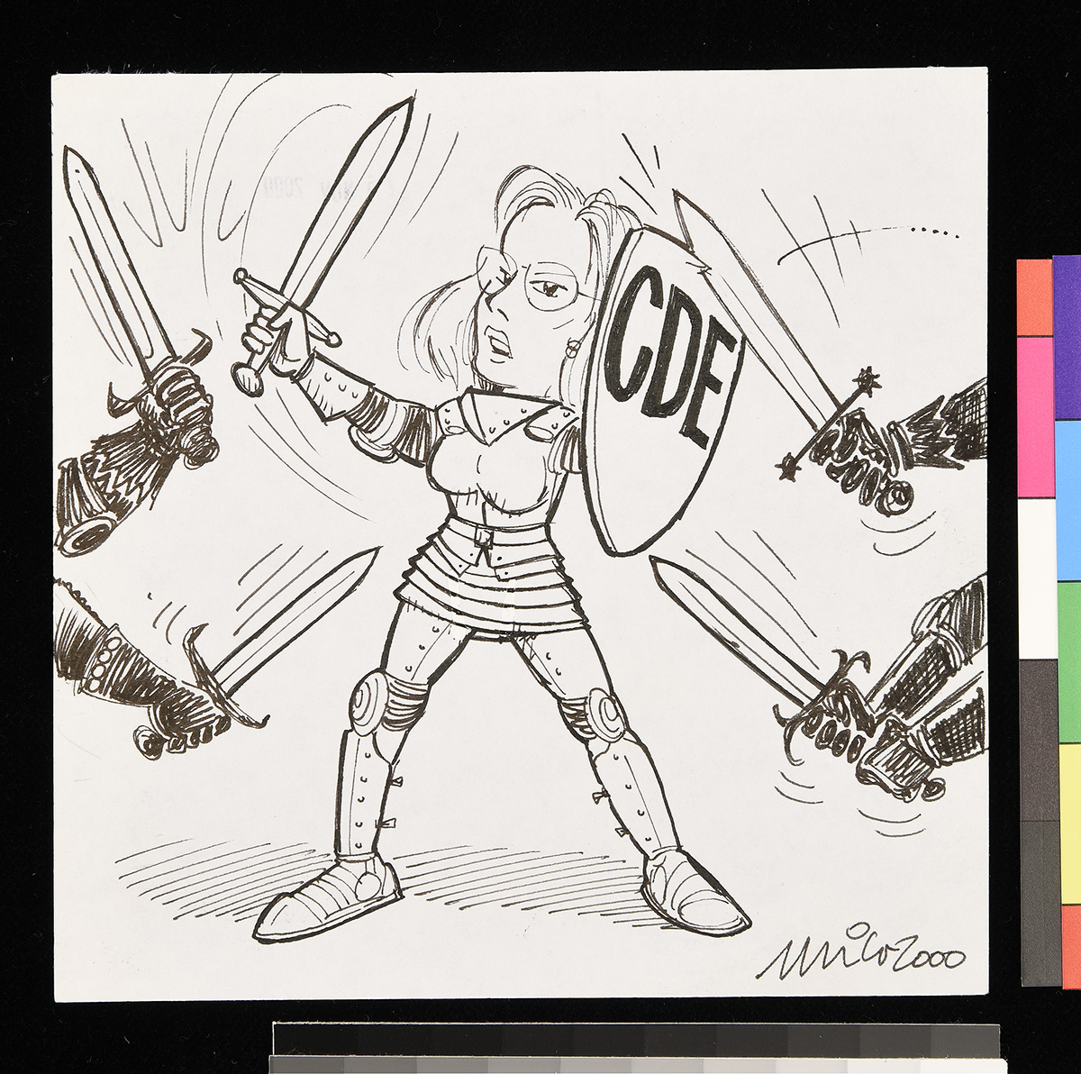 Dibujo de un hombre que se acerca corriendo a una mesa donde se encuentran varias personas, llevando en su cabeza un televisor.