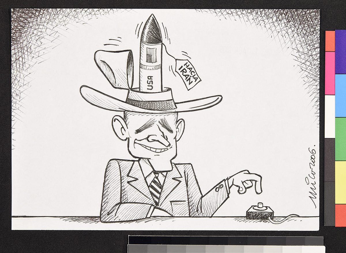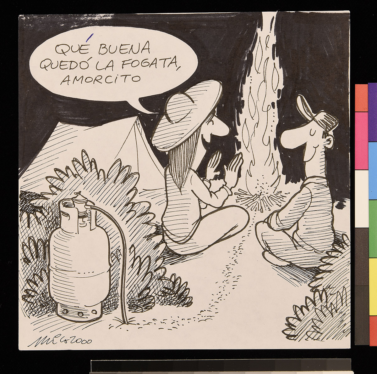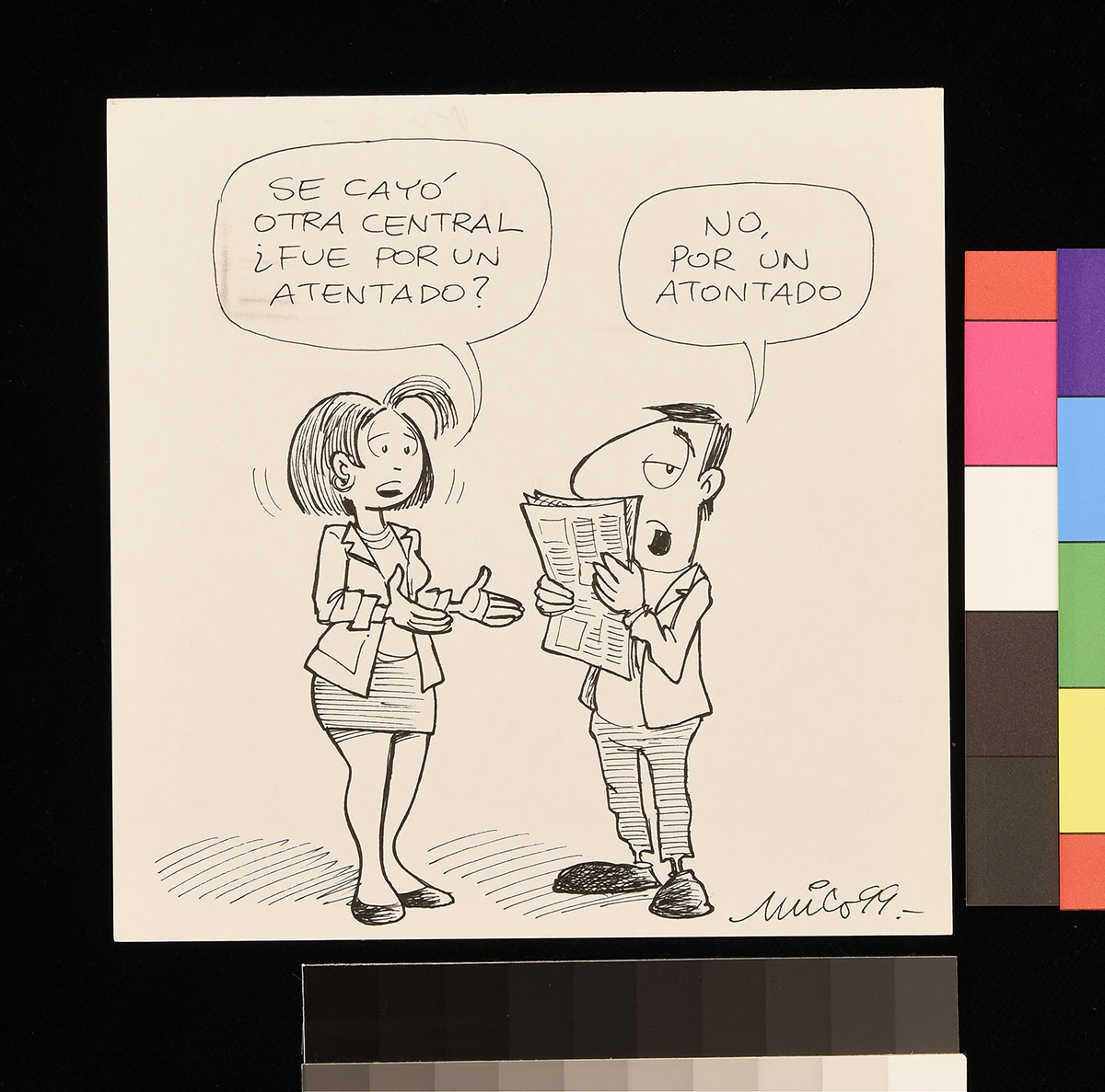 Dibujo de una mujer que sostiene una una de votación. Está frente a un hombre sentado en un escritorio con varias votos agrupados. Al costado izquierdo de la caricatura se ve a varias personas sentadas.
