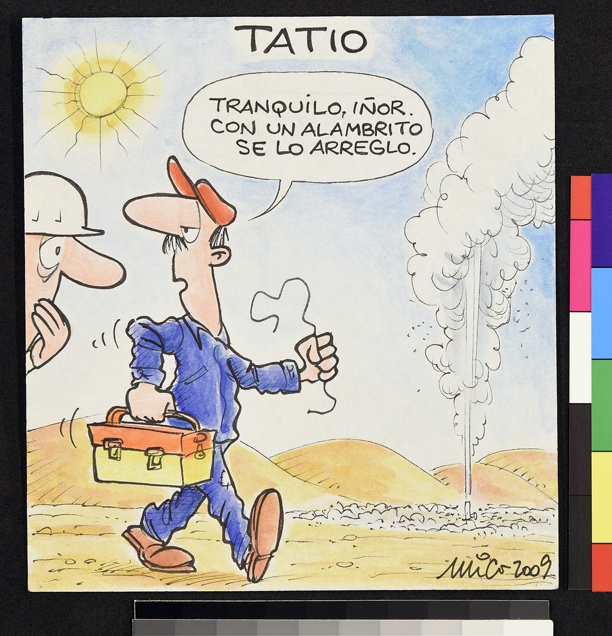 Dibujo de dos hombres conversando dentro de una cárcel. Uno de ellos, quien lleva anteojos, amenaza al otro hombre del cual posee una expresión de miedo.