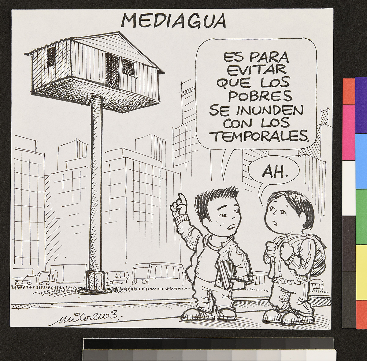 Dibujo de dos hombres de pie conversando frente a frente. Uno de ellos lee unos papeles que sostiene entre sus manos y el otro le muestra una identificación. Están al lado de la entrada a una habitación con un letrero a su lado que dice “Debate”.
