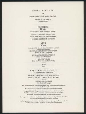 Una parte de la colección corresponde a menús de aerolíneas. Entre ellos destaca uno de la ruta Zúrich-Santiago, redactado en varios idiomas y dirigido a pasajeros de clase económica. Ese menú remite a un periodo en que la experiencia del comer formaba parte central del viaje en avión. Según un reportaje de Nathaniel Meyersohn para CNN publicado en 2024, hasta la desregulación de 1978 en Estados Unidos la legislación exigía que cada pasajero recibiera una comida completa como parte del pasaje, lo que llevó a las compañías a competir mediante la calidad del servicio. La posterior caída de precios redujo esa oferta y los recortes se intensificaron tras los atentados del 11 de septiembre de 2001, cuando varias aerolíneas eliminaron buena parte del servicio de comidas en la clase económica. Estos documentos registran cómo la gastronomía formaba parte de los vuelos en un momento histórico específico, muy distinto de la forma en que se viaja hoy en día.