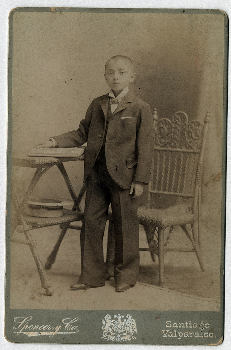 Retrato de un niño con pelo raso y terno tres piezas. Se encuentra de pie al lado de una mesa con su brazo apoyado sobre un libro abierto. Atrás de él se ve una silla.