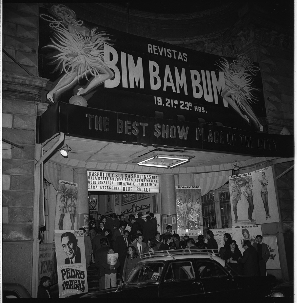 Fachada de acceso a un teatro, donde destacan la publicidad de los shows que ofrecen. Muchas personas se encuentran en las escaleras de acceso al teatro.