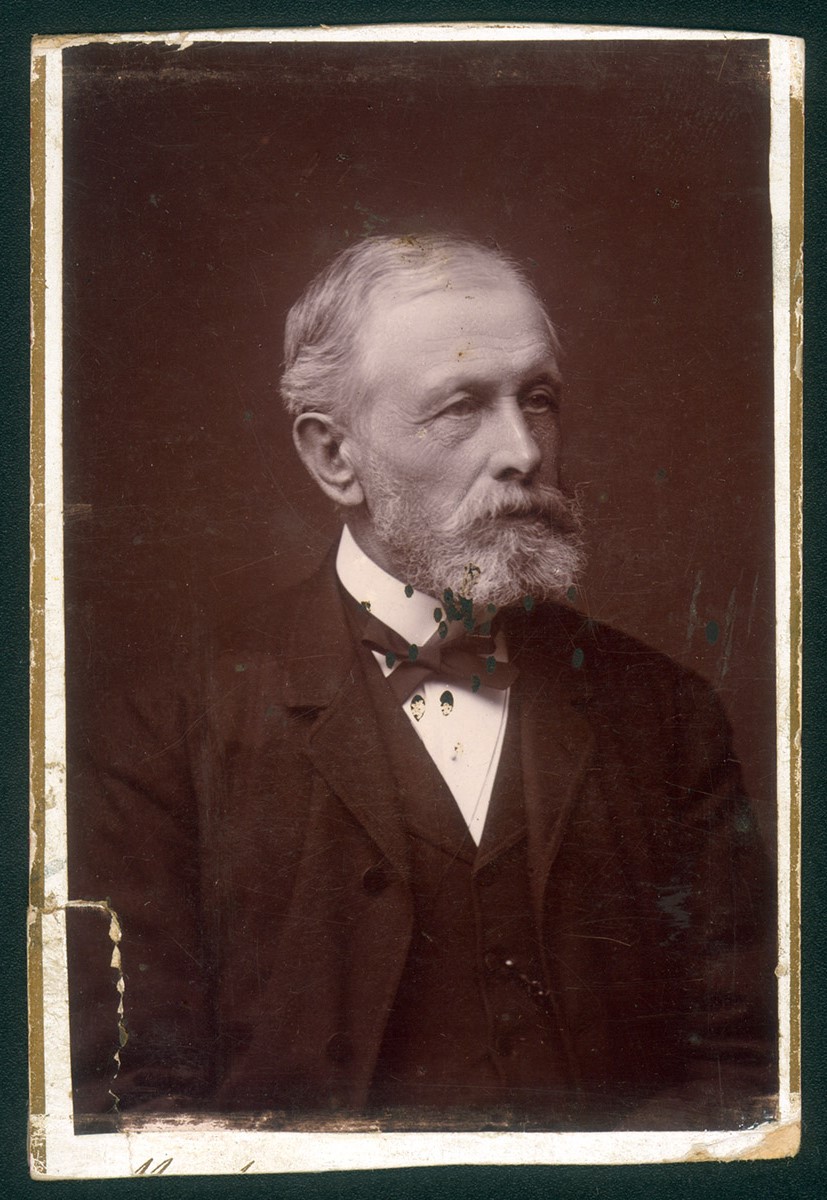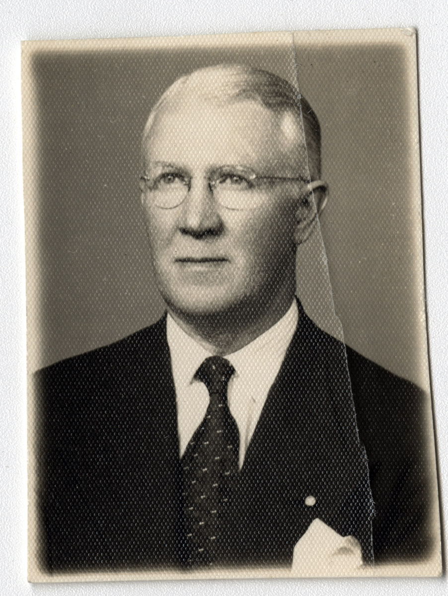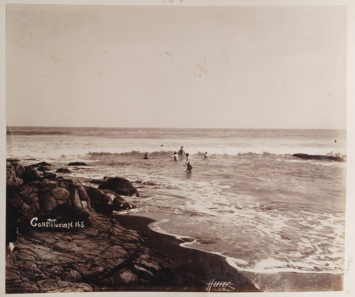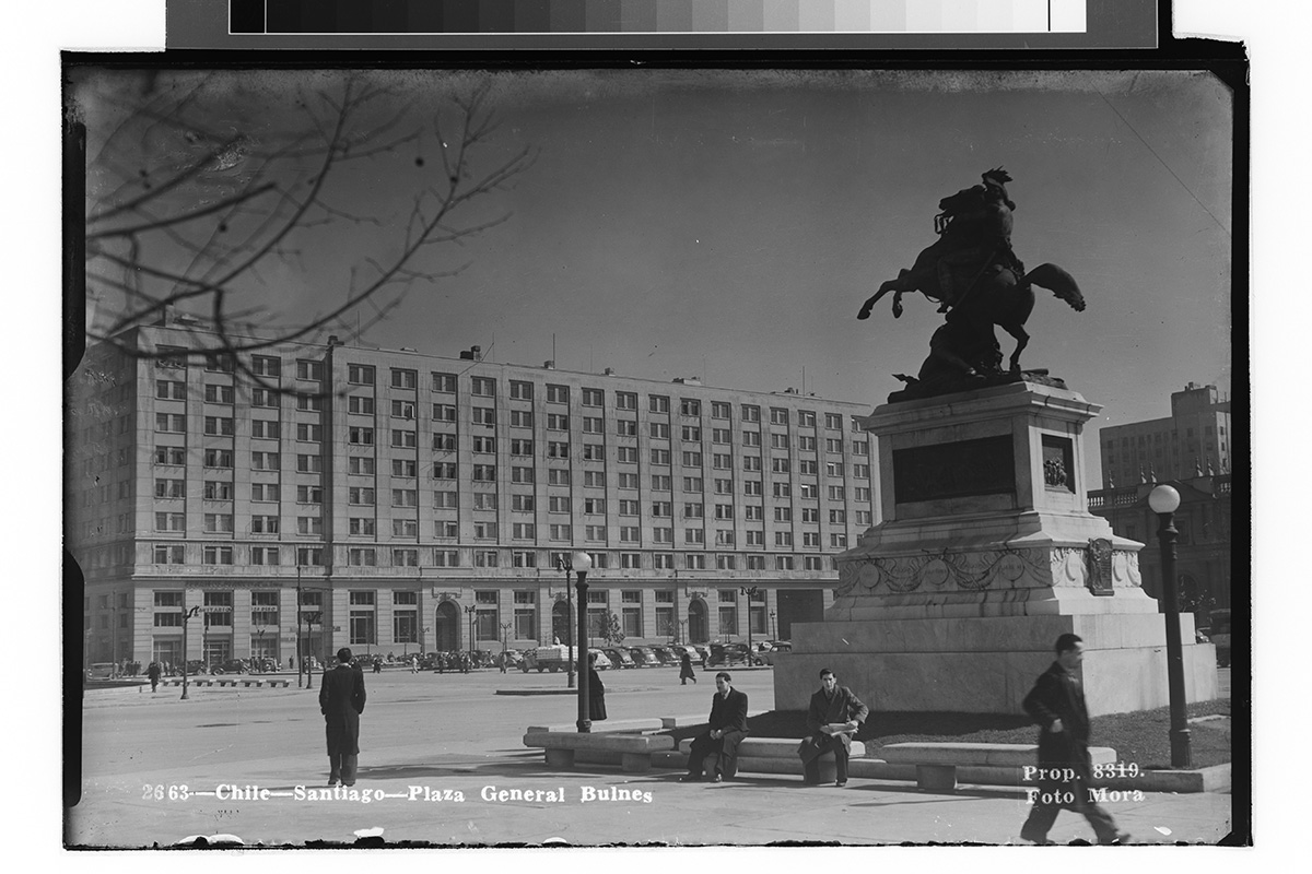 Vista de un camino con rieles de ferrocarril en el medio, sobre las cuales están parados o sentados unas personas. Atrás se ven dos galpones y dos chimeneas.