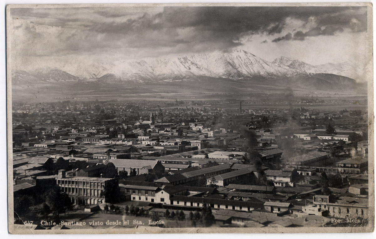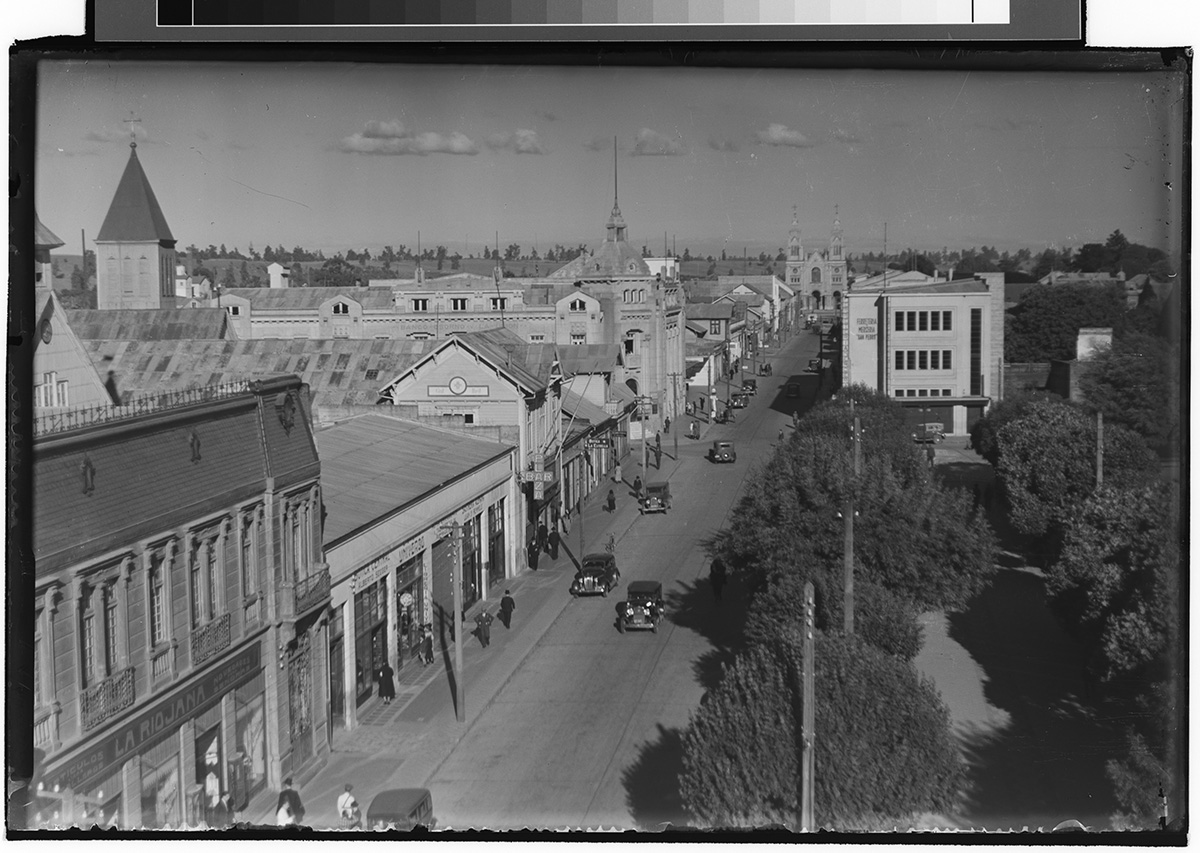 Vista de un camino con rieles de ferrocarril en el medio. En segundo plano se ven montañas nevadas y a la izquierda una barrera.