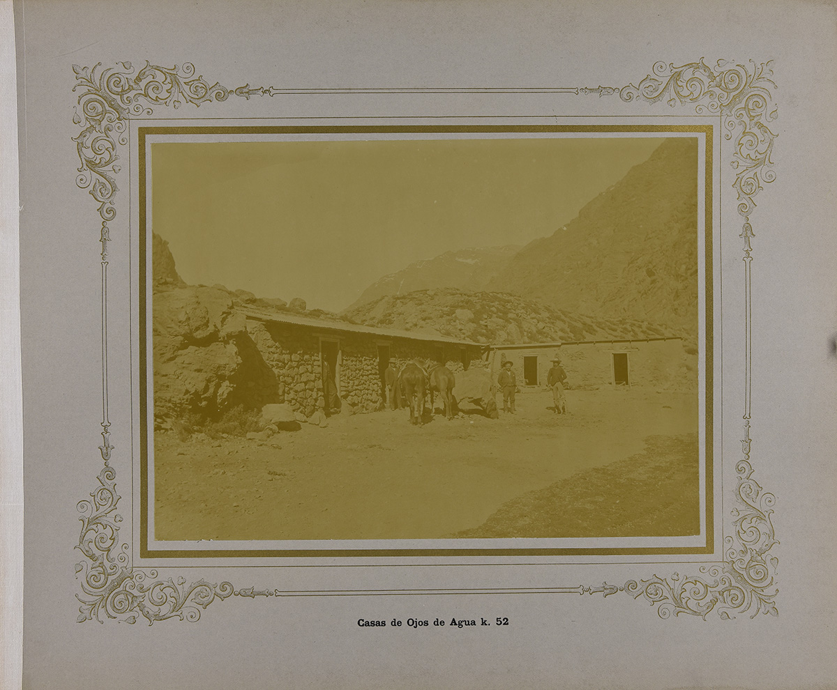 Varios hombres y caballos se encuentran junto a una construcción de piedra solo con puertas con marcos de madera. De fondo, un paisaje cordillerano.