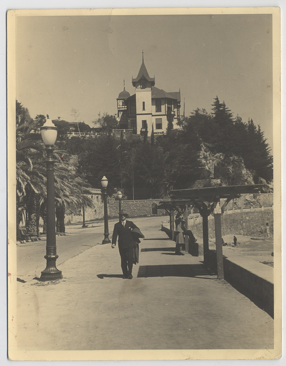 Vista de un valle con montañas nevadas en segundo plano. Dos hombres y un niño están posando.
