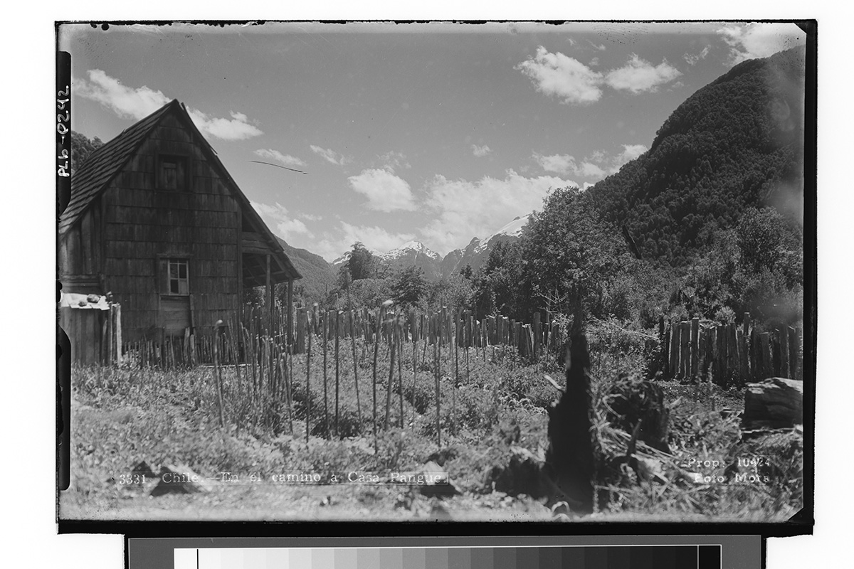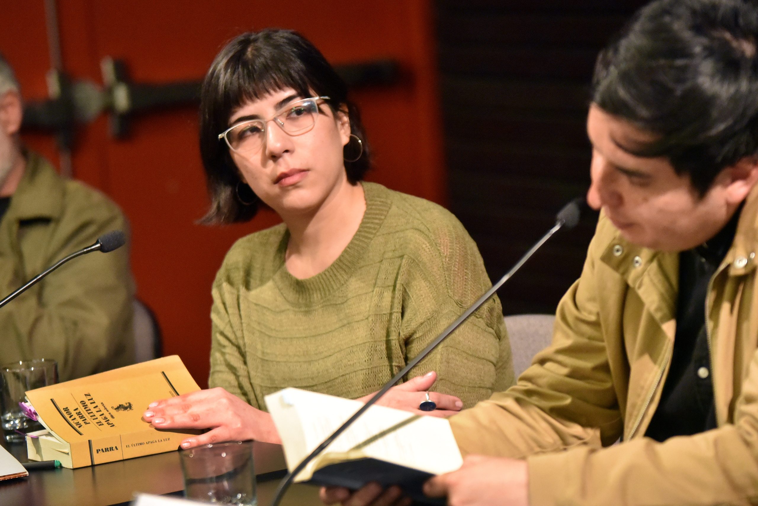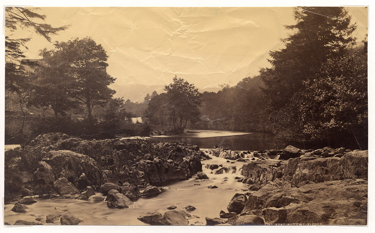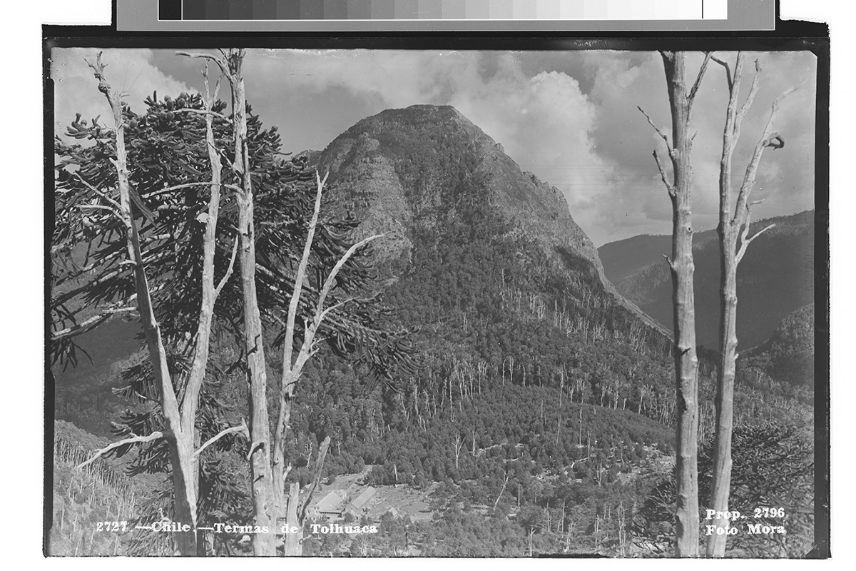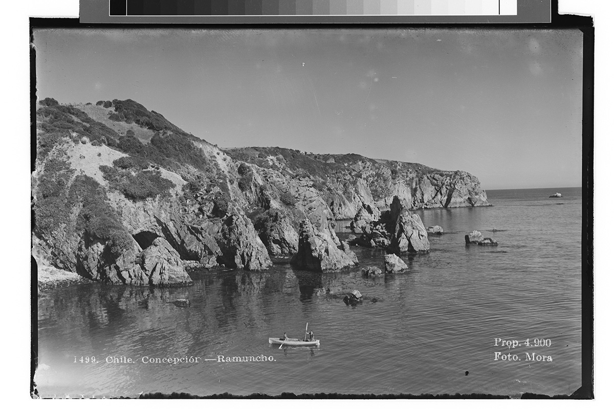 Panorámica ladera rocosa hacia el mar, grandes rocas semi triangulares en la orilla del mar, un bote con dos personas, cada una con un remo en la mano.