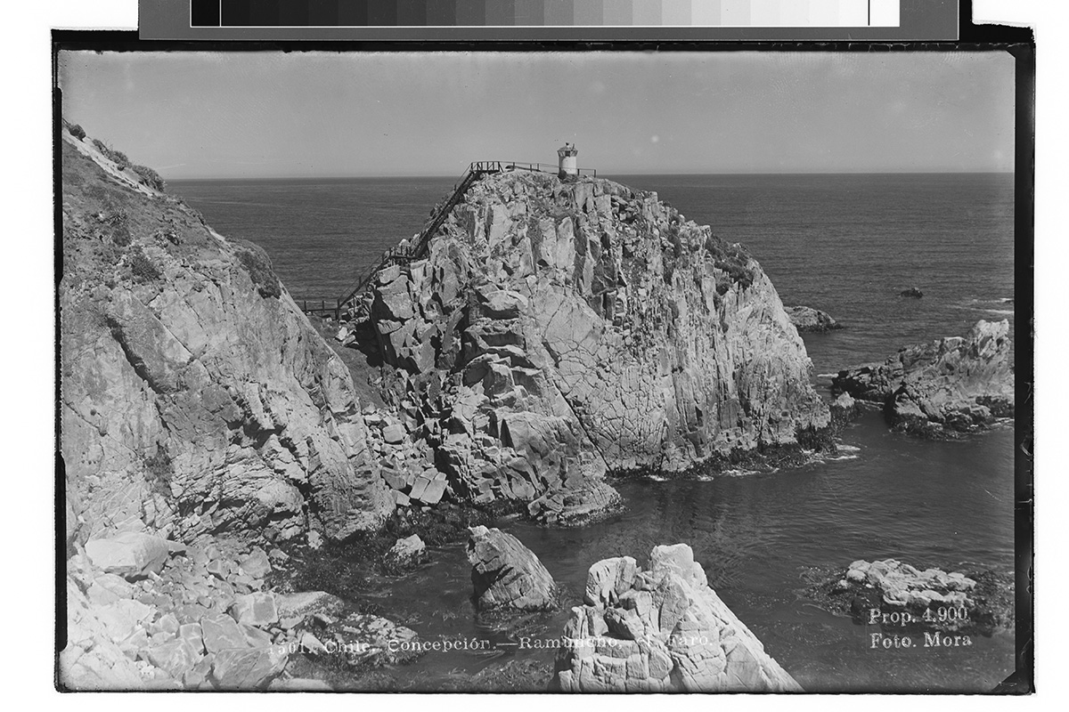 Faro construido en la cima de formación rocosa en la orilla del mar, una escalera por el borde de la roca.