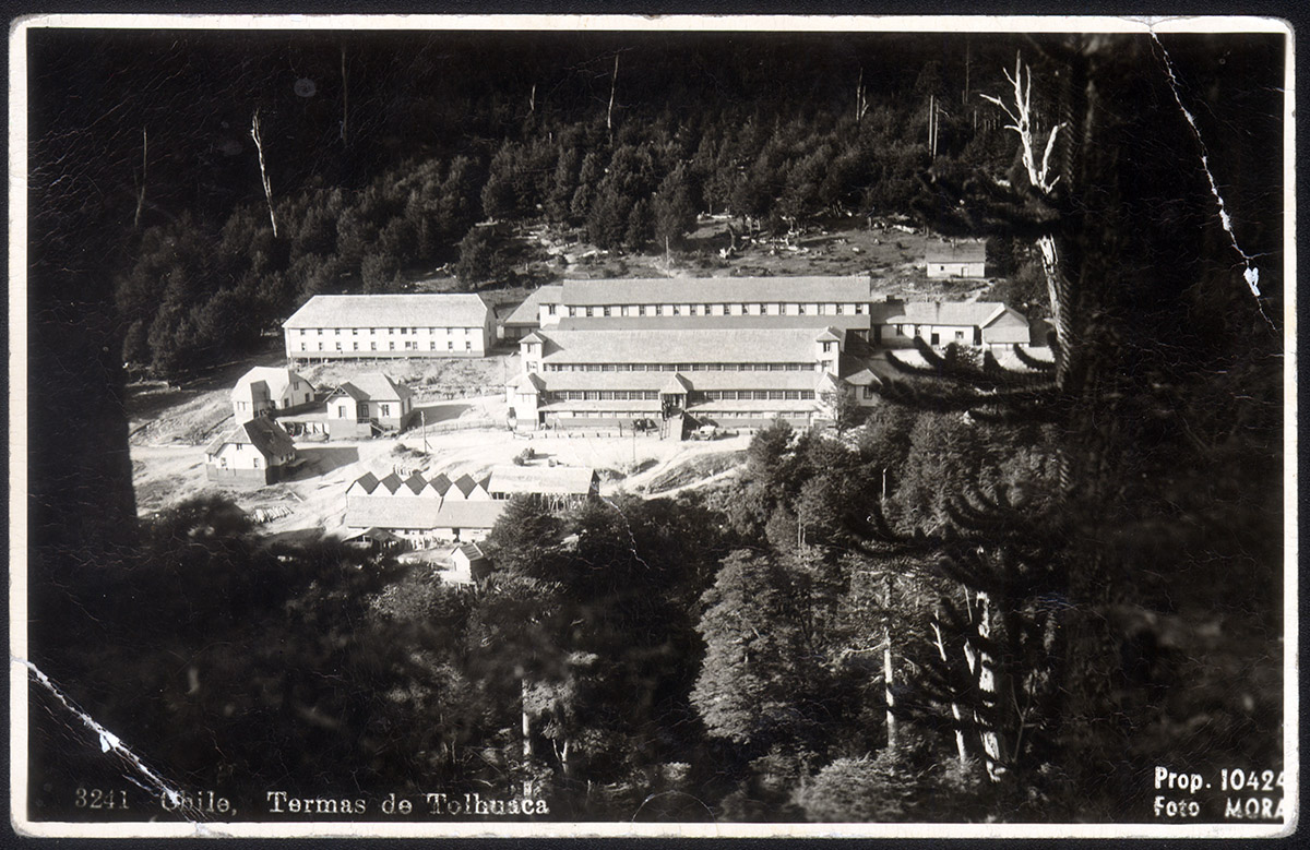 VIsta del terreno que es parte de una construcción de madera de varios pisos, rodeada de otras construcciones y árboles. De fondo parte de un lago junto a un volcán nevado.