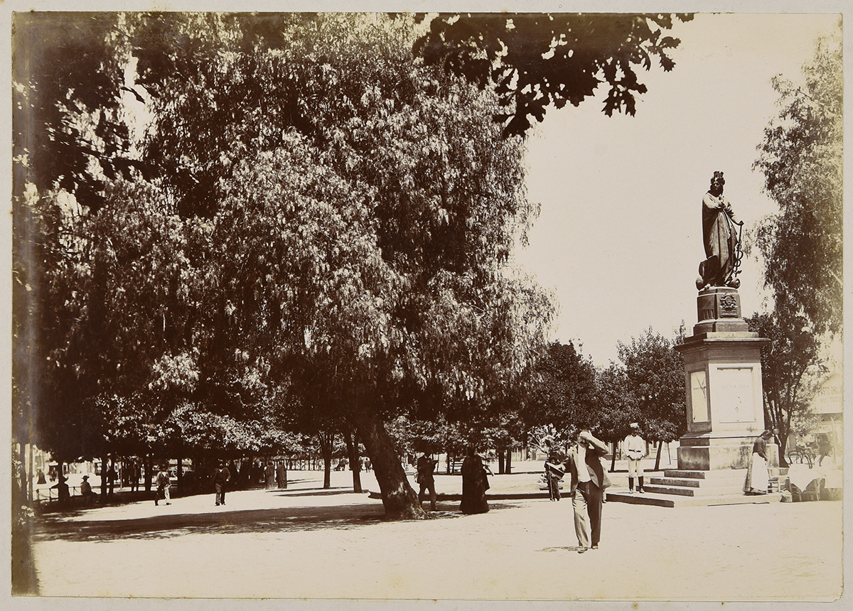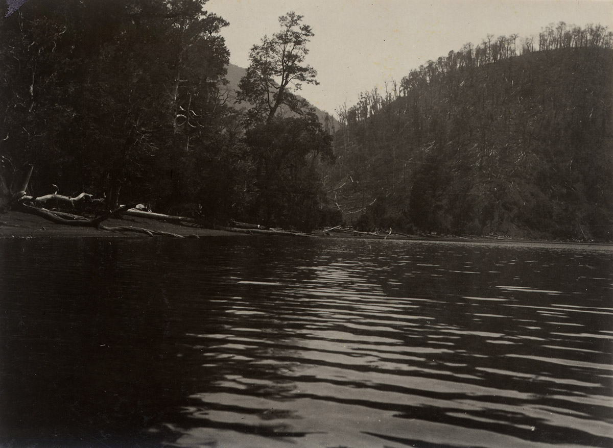 Vista de la orilla de un lago, donde se aprecia varios árboles y Vegetación. De fondo, parte de las laderas de cerros que rodean el lago y un volcan envuelto en nieve.
