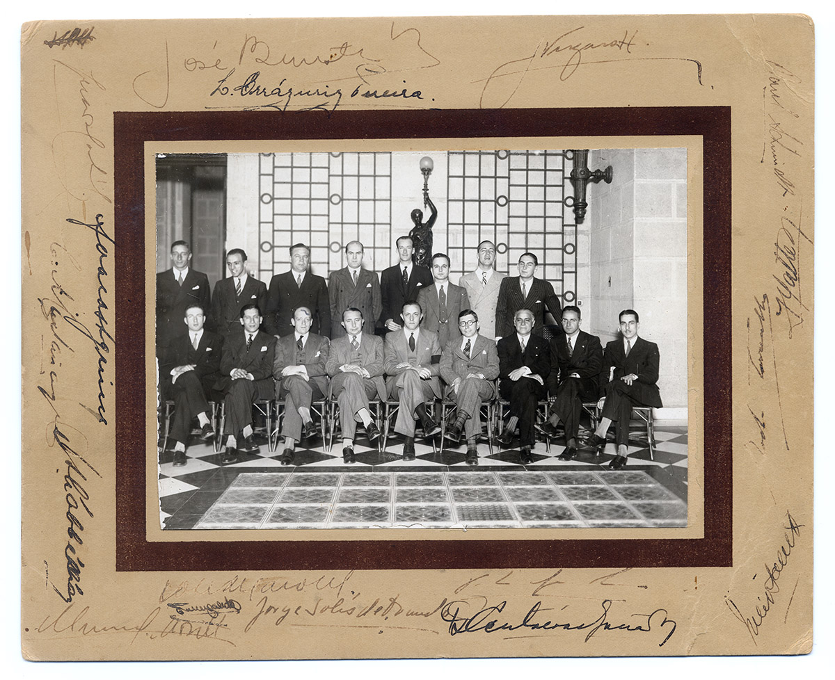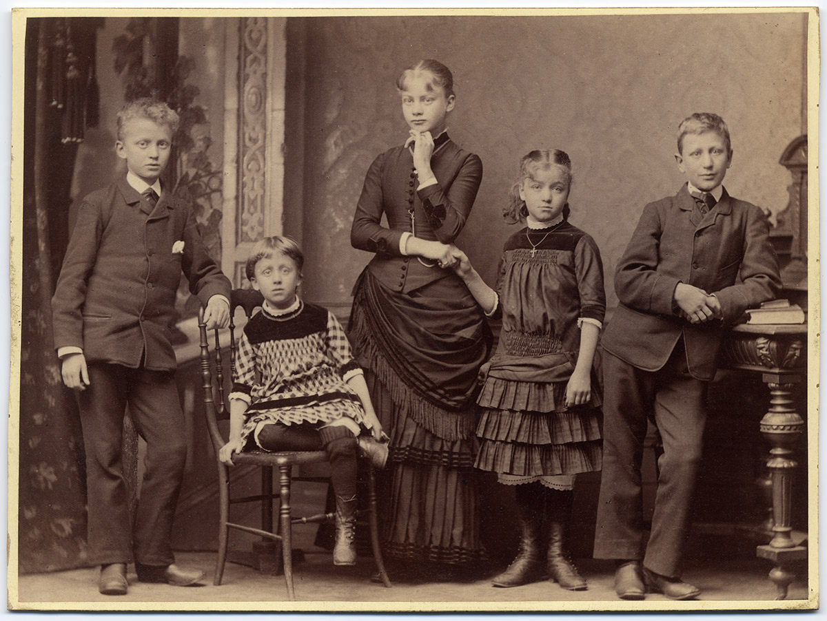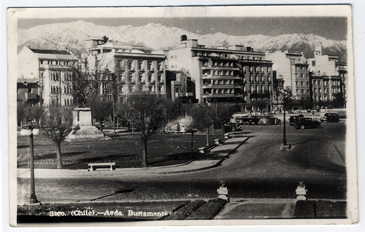 Vista de una calle céntrica, rodeada de edificios de variada altura, la gran mayoría de madera. Se encuentran algunos peatones transitando por sus veredas y un microbús en la calle.