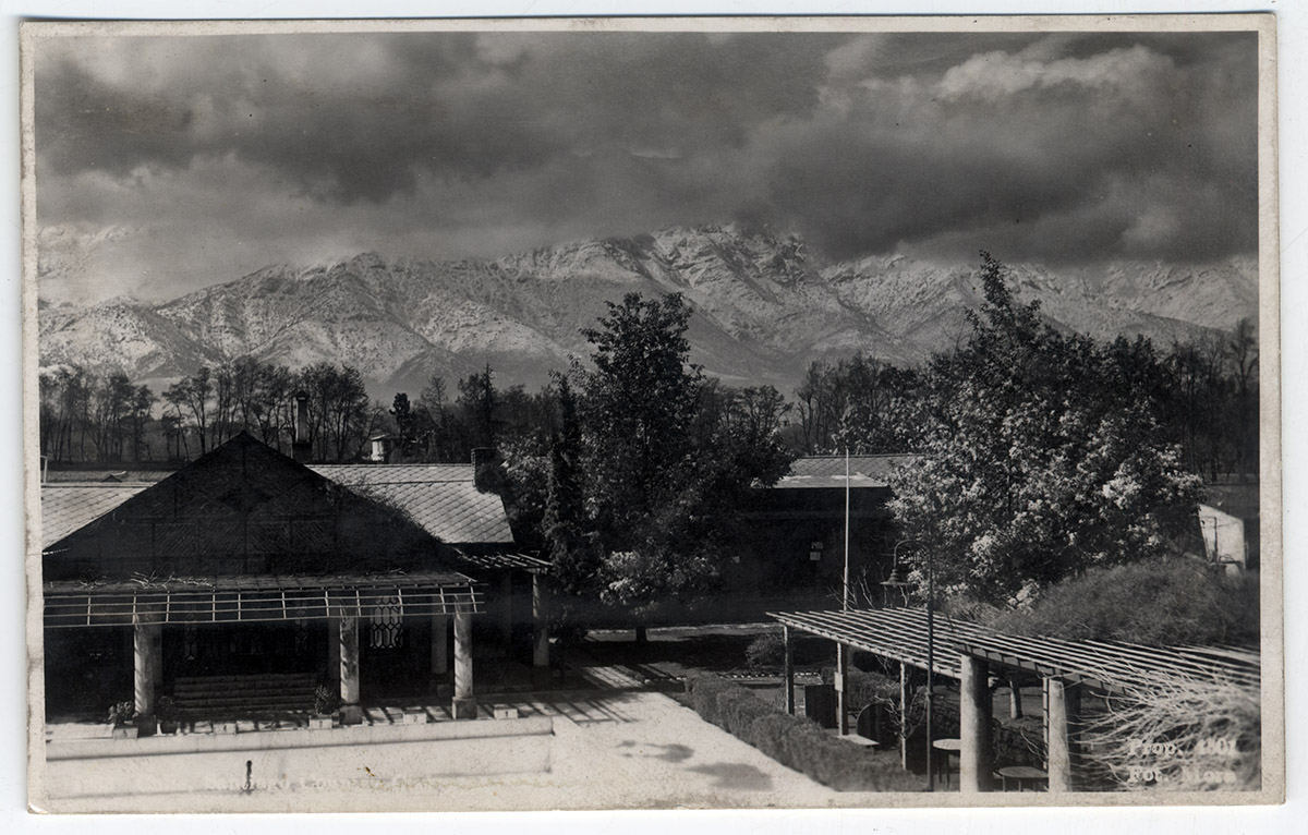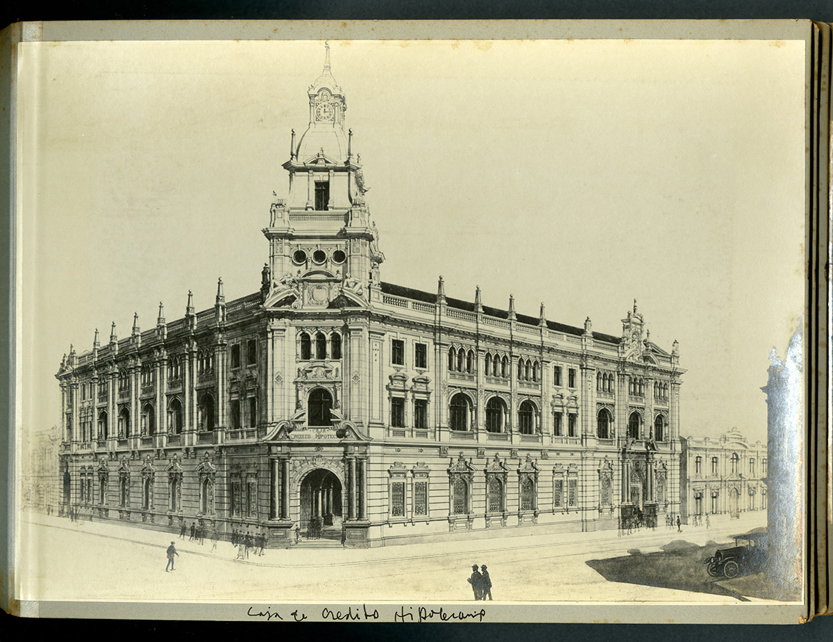 Vista gran construcción en esquina, cinco pisos, terraza con barandas en el techo, escrito en el edificio “Hotel Burnier, locales comerciales en primer piso a la calle. Automóviles y peatones pasando.