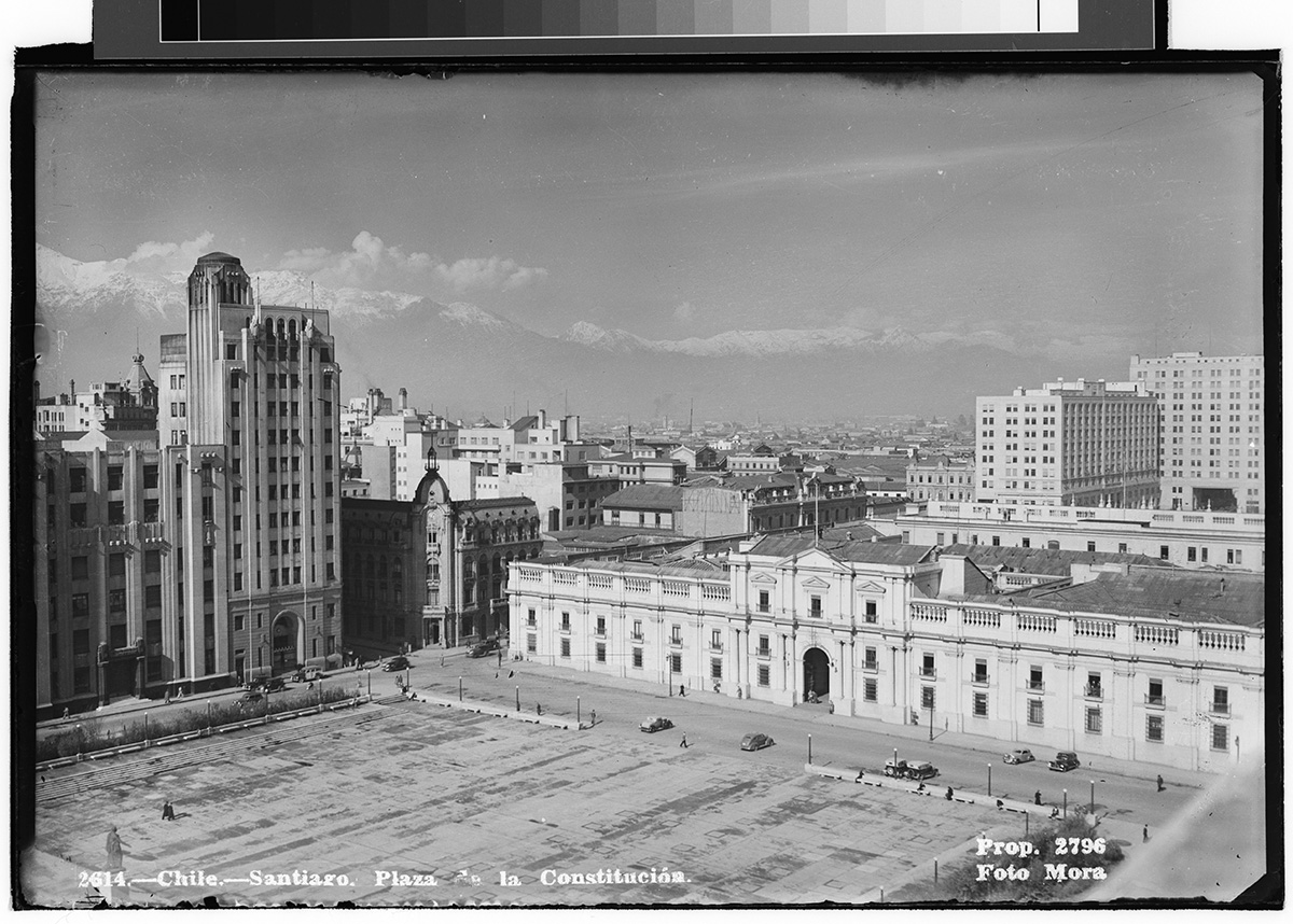 Gran construcción en esquina, reloj en la parte más alta, por el costado derecho una pintura de un grupo de personas arriba de la ventana. rodeado de pilares y una reja en separación de la calle.