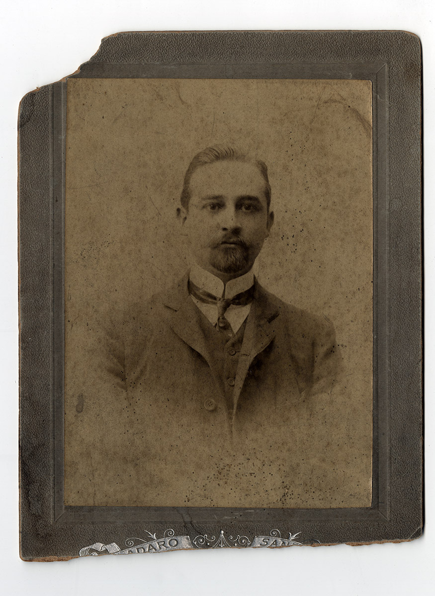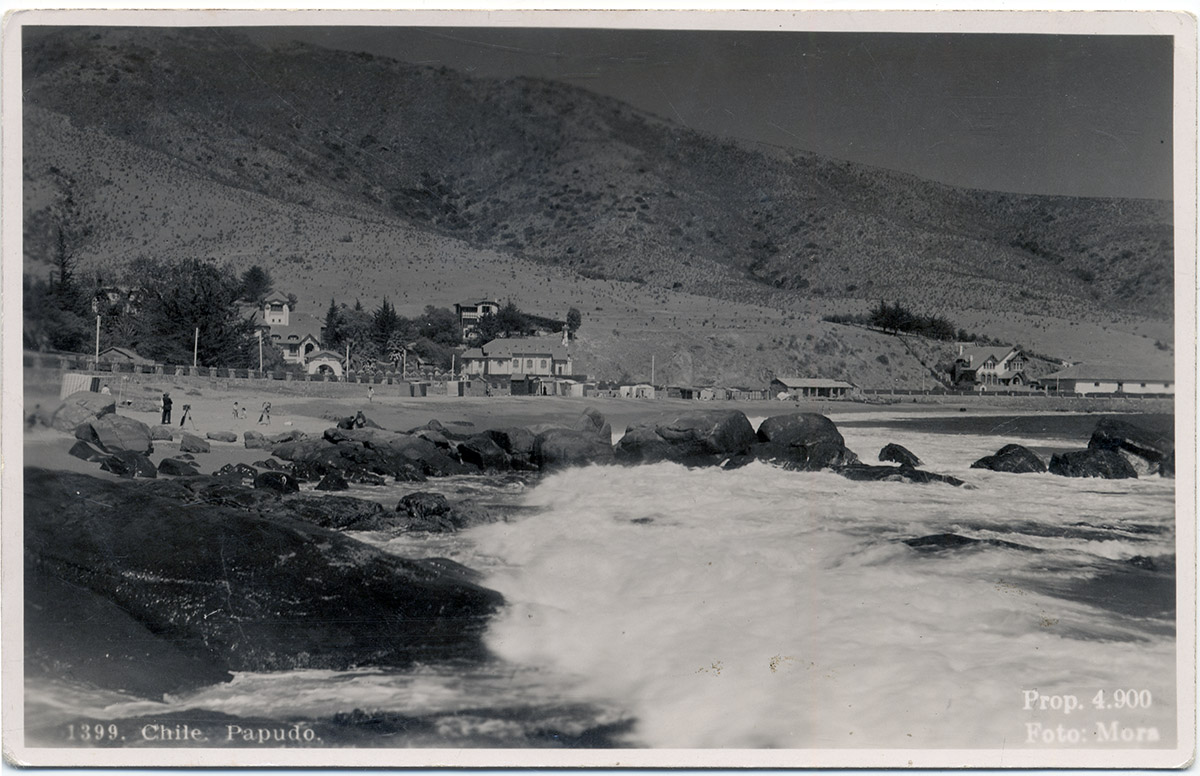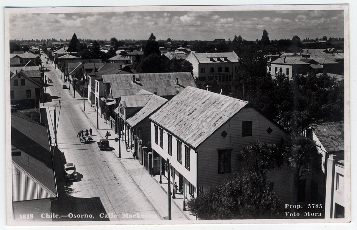 Vista parcial de una plaza, donde el centro de ella se encuentra despejado y rodean árboles de mediana estatura. Alrededor de la plaza, varios edificios. de fondo, la vista de un volcán.