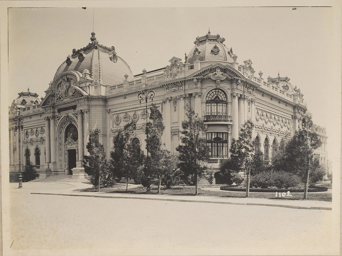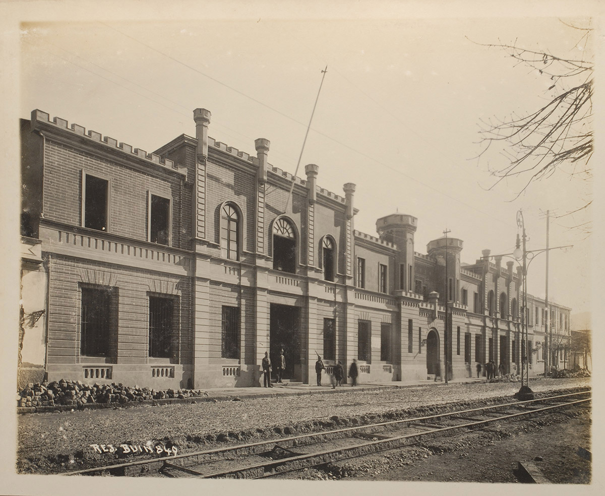 Sendero de tierra, rodeado de palmeras. Al final del sendero una entrada con dos grandes pilares y una reja a una construcción de un piso y grandes ventanales.