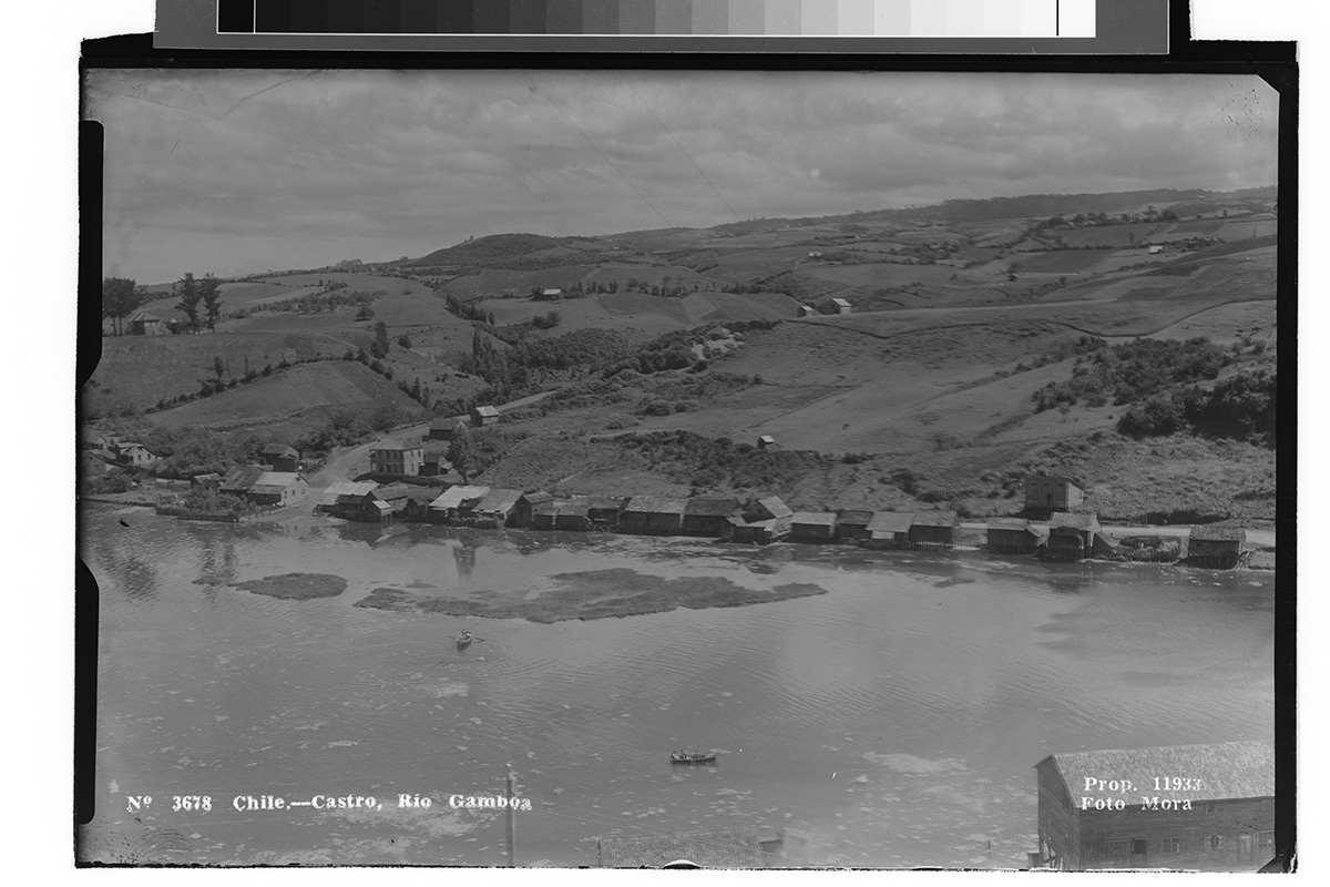 Vista entre Árboles hacia varias construcciones de madera que son parte de una ciudad costera. De fondo un barco navegando
