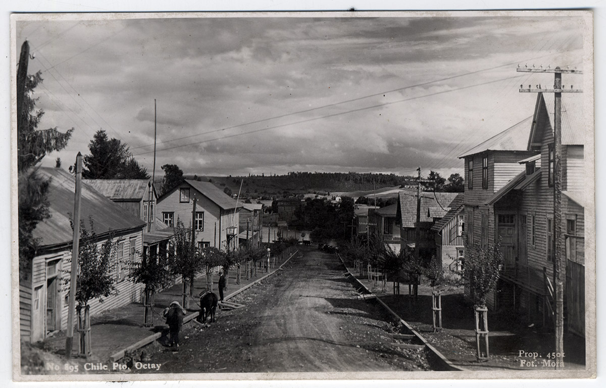 En el centro de la fotografía, una calle de tierra rodeado de árboles y de casas de madera. Se encuentran dos caballos detenidos junto a una persona en la orilla del camino.