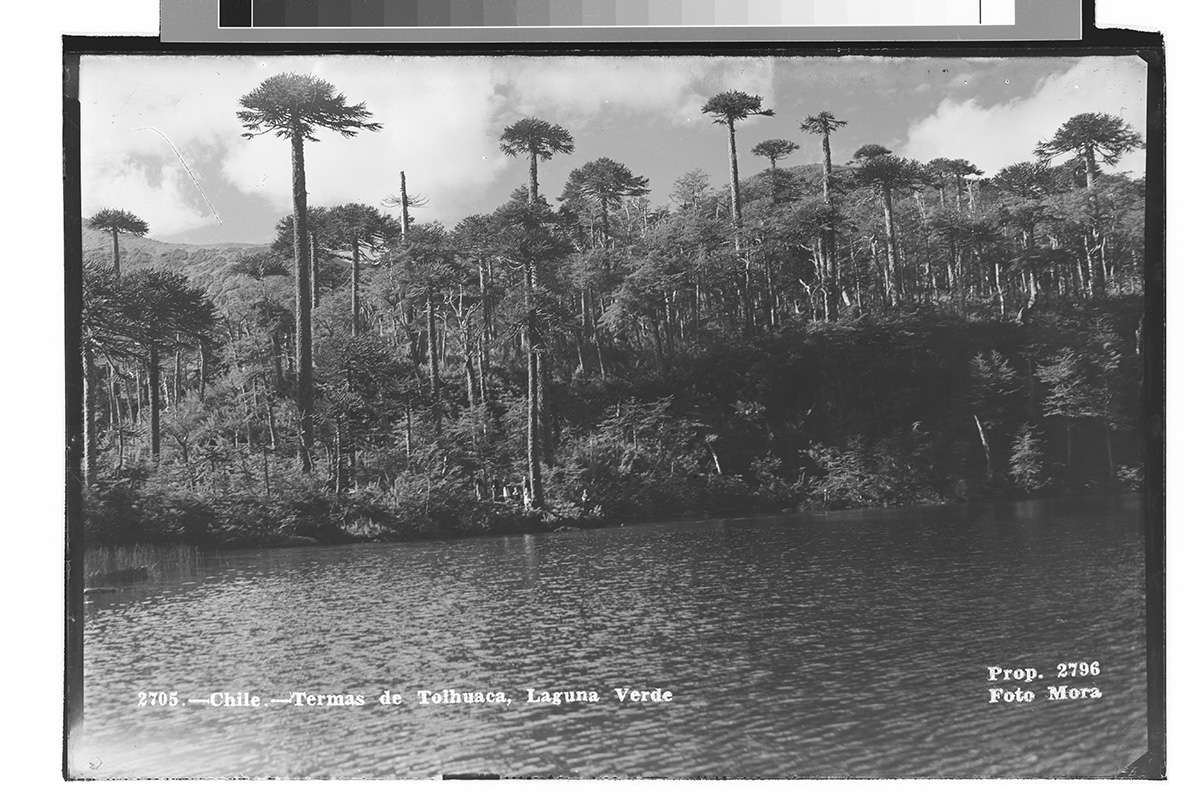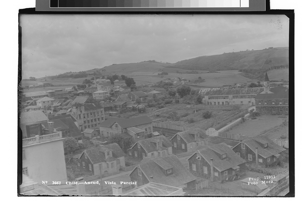 Vista de una ciudad, junto a un lago, donde destaca una iglesia. De fondo, un volcán con nieve.