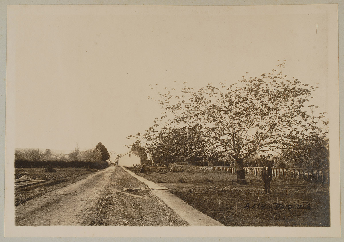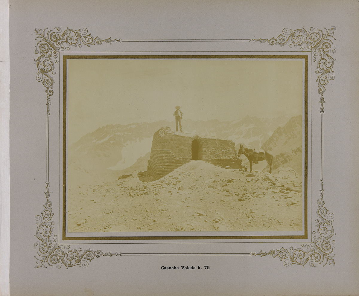 Un hombre con sombrero se encuentra en la orilla de un río. En el fondo, un volcán cubierto de nieve.