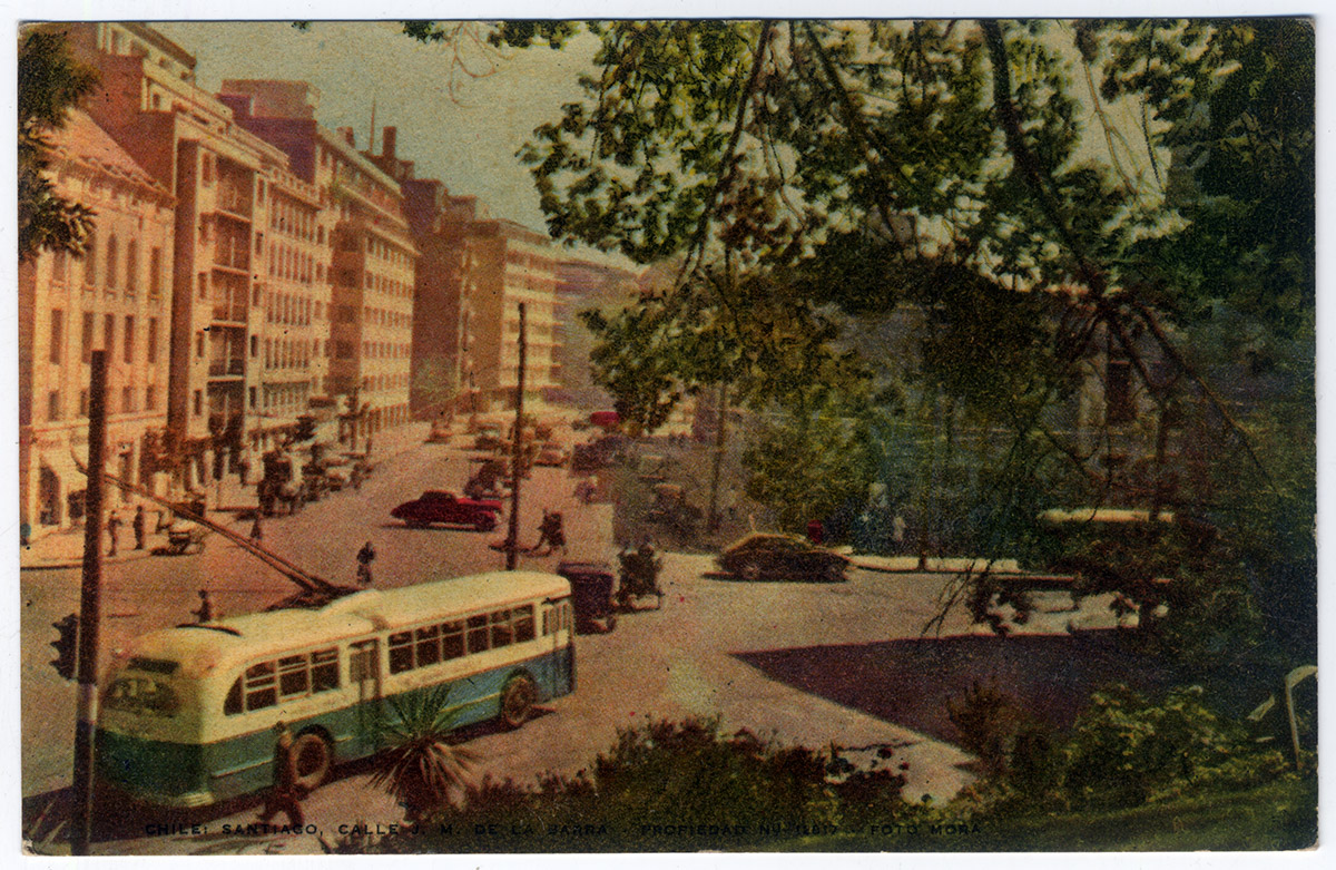 Estructura de madera, en la cual se aprecian dos especies de carretas. En la parte superior derecha un volcán nevado