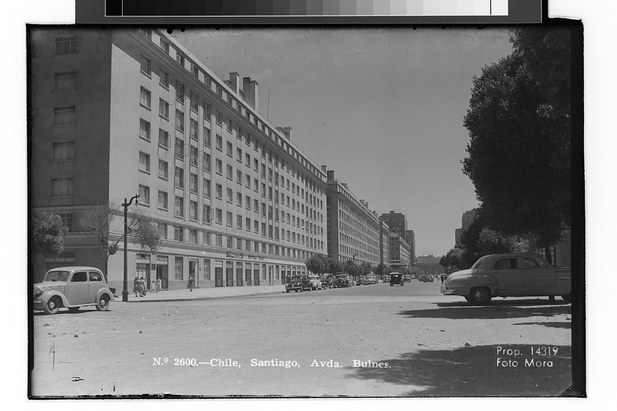 Vista de una ancha calle donde circulan Automóviles. Al costado izquierdo de la fotografía, varios edificios de fachada continua. Al costado derecho, varios Árboles.