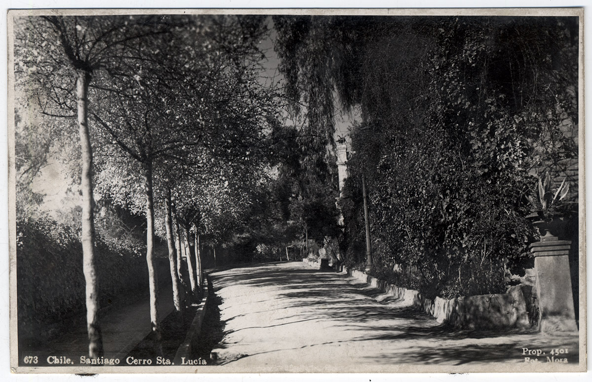 Vista de un camino, rodeado por abundante vegetación principalmente arboles y enredaderas junta a la vereda que va la costado izquierdo de la fotografía.