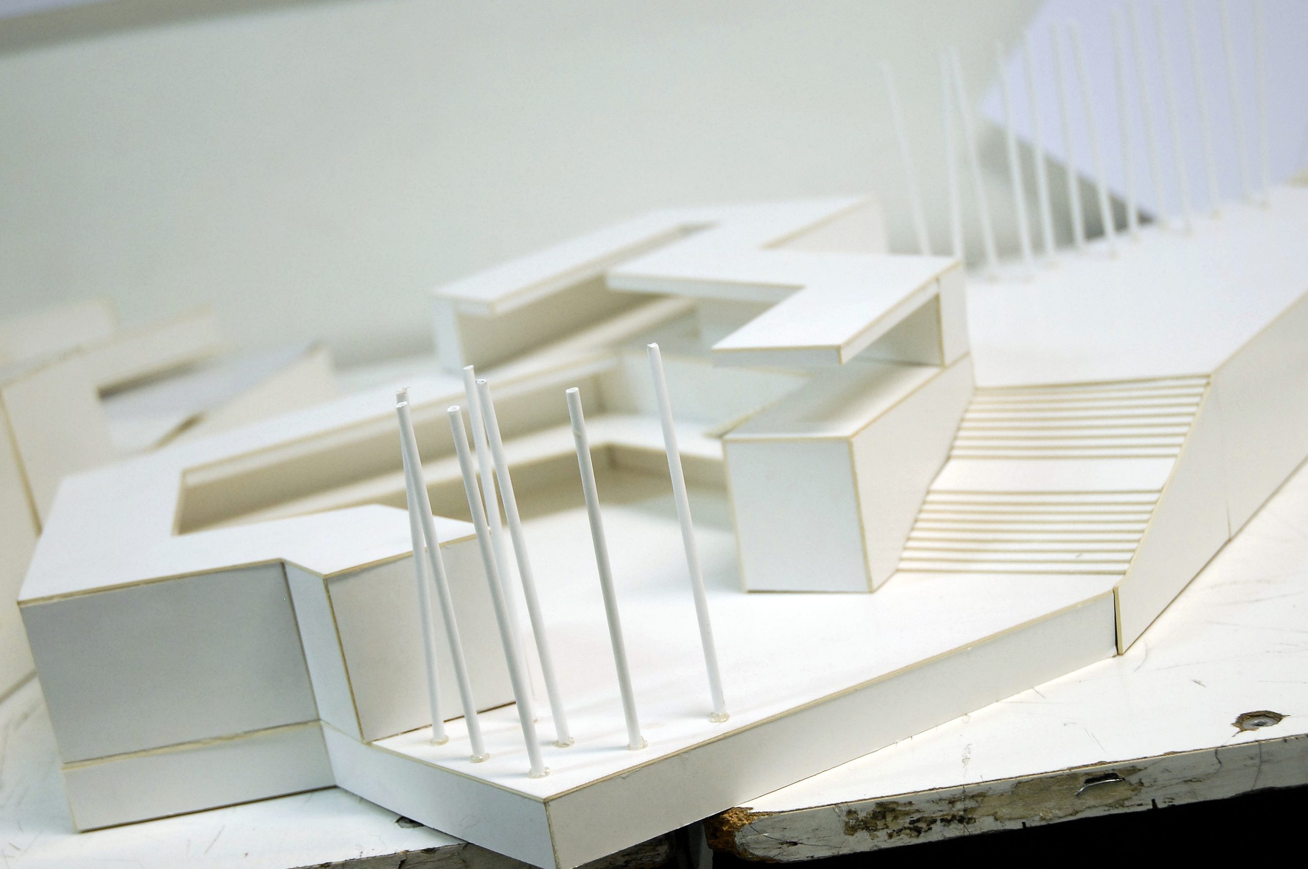 Vista de fachada de un edificio de mediana altura, rodeado de jardines. En el acceso techado se encuentra un automóvil estacionado. De fondo, una cordillera nevada.