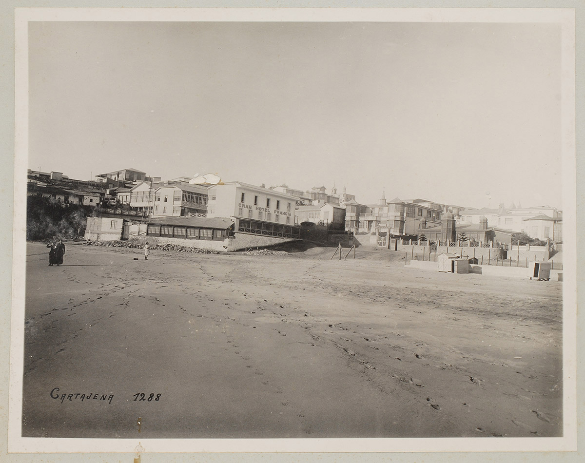 Un edificio de gran tamaño, con cuatro pisos y balcones, además de varias torres, frente a un pequeño parque en cual se encuentra un grupo de personas.
