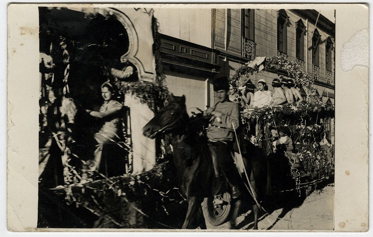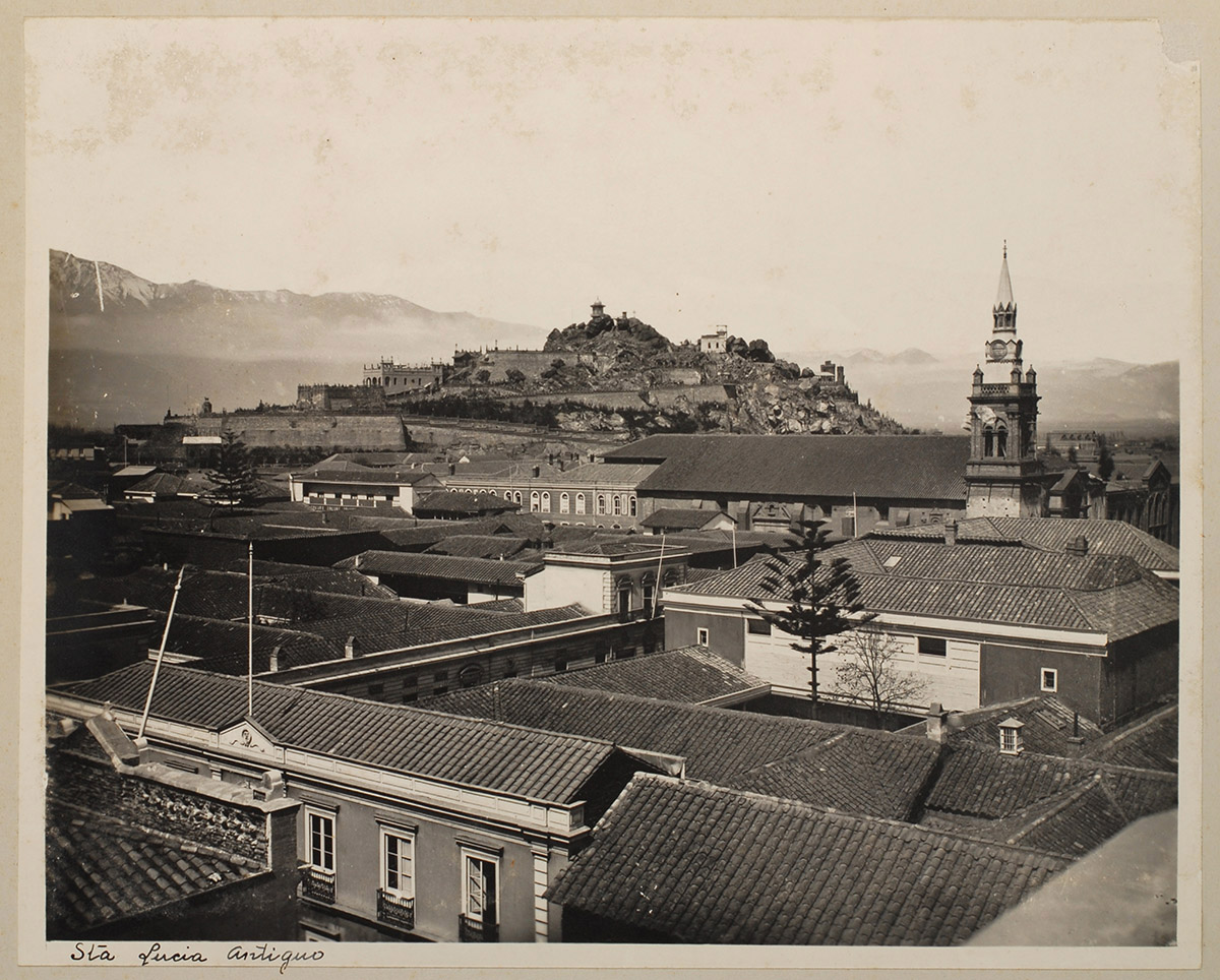 Costado de la fachada de una iglesia con una torre con un reloj en lo alto y en cada una de sus caras. Al costado de la iglesia una calle, con automóviles y personas que transitan en ella.